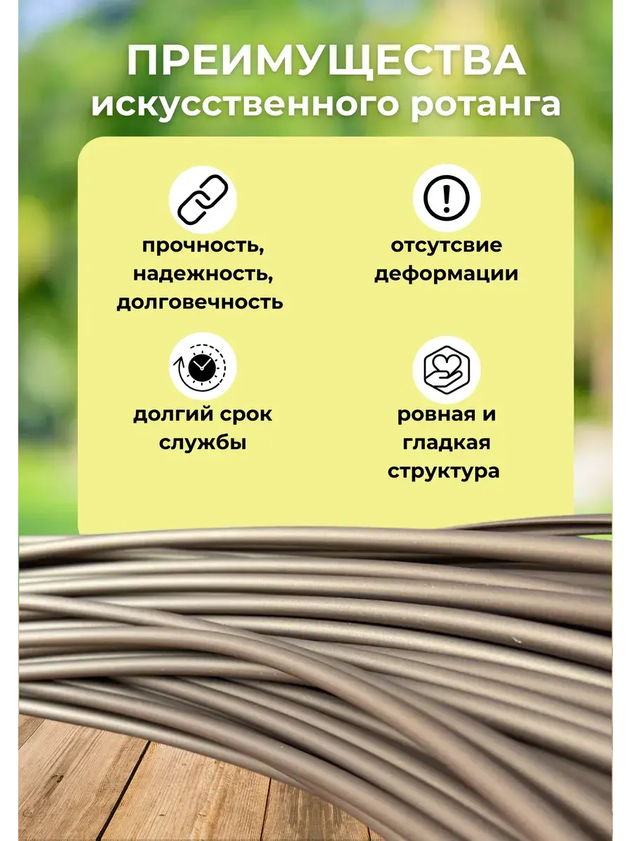 Искусственный ротанг для плетения — это современный материал, который идеально подходит для создания стильной и долговечной мебели. Полиротанг - это универсальный материал, который может использоваться для создания различных изделий. Он может стать незаменимым украшением вашего интерьера и сада. Прочный, долговечный и экологичный материал. Этот аксессуар для плетения прочный и долговечный, не выгорает на солнце, а также не подвержен воздействию влаги и перепаду температур, доступная цена, что делает его идеальным вариантом для использования на открытом воздухе. Этот материал легко чистится и не требует специального ухода, что делает его комфортным в использовании для любого интерьера. Благодаря использованию ротанга, изделия получают необходимую прочность и долговечность. Rammus экоротанг- это 100% экологически чистый полимерный материал нового поколения, который производится по уникальной формуле, разработанной технологами фабрики RAMMUS. В качестве компонентов для изготовления экоротанга применяется сугубо первичное сырье от мирового бренда Sabic - гранулированный полиэтилен высокого давления, полиэтилен низкого давления и линейный полиэтилен, а также краситель Masterbatch.