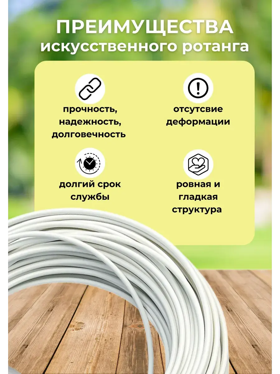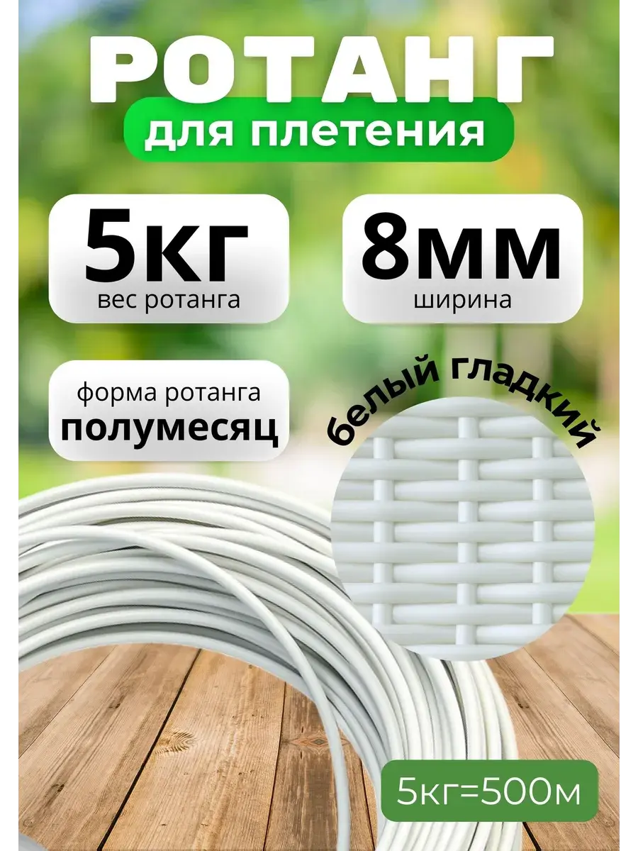 Искусственный ротанг для плетения — это современный материал, который идеально подходит для создания стильной и долговечной мебели. Полиротанг - это универсальный материал, который может использоваться для создания различных изделий. Он может стать незаменимым украшением вашего интерьера и сада. Прочный, долговечный и экологичный материал. Этот аксессуар для плетения прочный и долговечный, не выгорает на солнце, а также не подвержен воздействию влаги и перепаду температур, доступная цена, что делает его идеальным вариантом для использования на открытом воздухе. Этот материал легко чистится и не требует специального ухода, что делает его комфортным в использовании для любого интерьера. Благодаря использованию ротанга, изделия получают необходимую прочность и долговечность. Rammus экоротанг- это 100% экологически чистый полимерный материал нового поколения, который производится по уникальной формуле, разработанной технологами фабрики RAMMUS. В качестве компонентов для изготовления экоротанга применяется сугубо первичное сырье от мирового бренда Sabic - гранулированный полиэтилен высокого давления, полиэтилен низкого давления и линейный полиэтилен, а также краситель Masterbatch.
