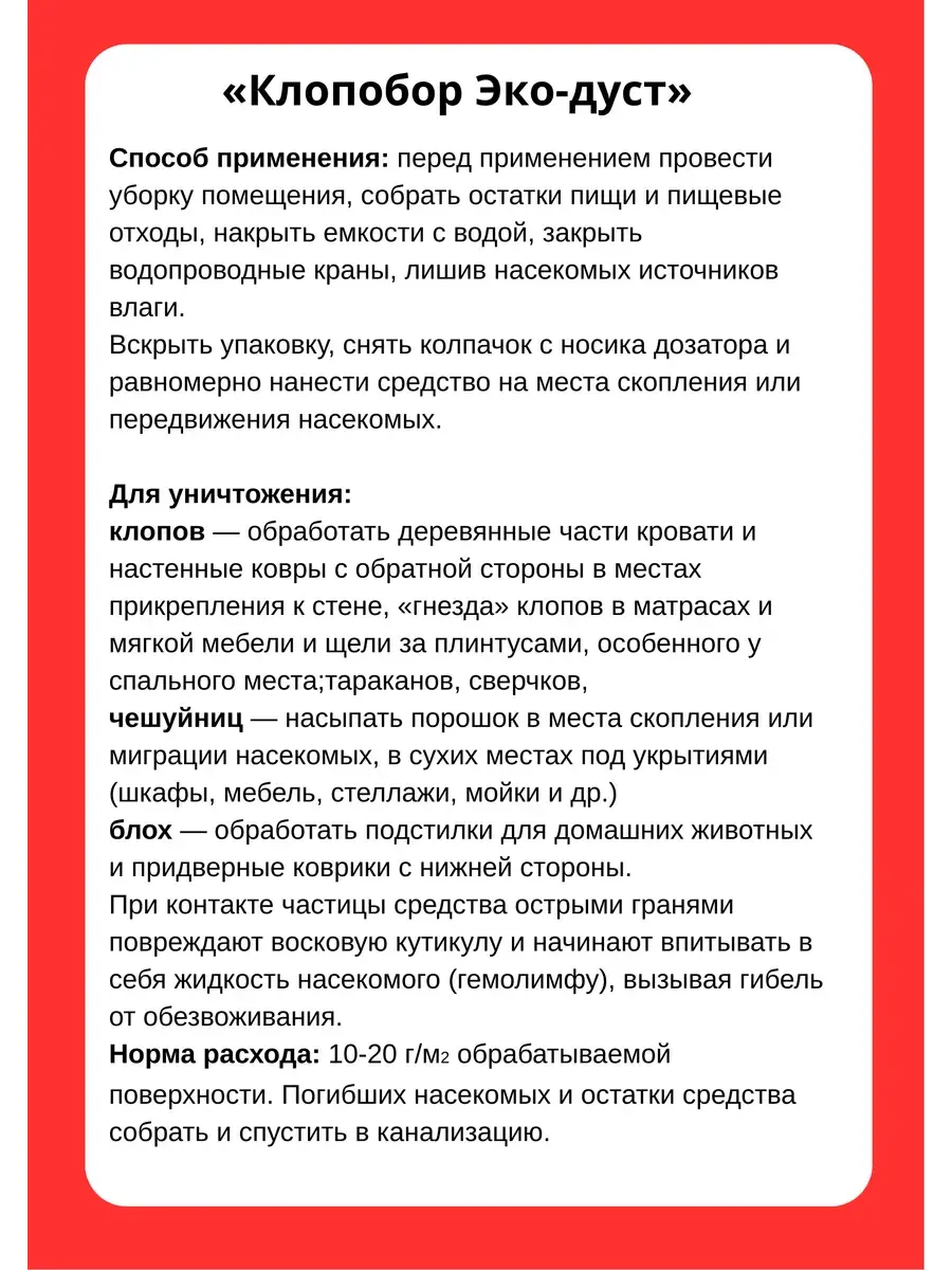 ПРИМЕНЕНИЕ: перед применением провести уборку помещения, собрать остатки пищи и пищевые отходы, накрыть емкости с водой, закрыть водопроводные краны, лишив насекомых источников влаги. Вскрыть упаковку, снять колпачок с носика дозатора и равномерно нанести средство на места скопления или передвижения насекомых. Для уничтожения: клопов — обработать деревянные части кровати и настенные ковры с обратной стороны в местах прикрепления к стене, «гнезда» клопов в матрасах и мягкой мебели и щели за плинтусами, особенного у спального места; тараканов, сверчков, чешуйниц — насыпать порошок в места скопления или миграции насекомых, в сухих местах под укрытиями (шкафы и мебель, стеллажи и мойки и др.) блох — обработать подстилки для домашних животных и придверные коврики с нижней стороны. При контакте частицы средства острыми гранями повреждают восковую кутикулу и начинают впитывать в себя жидкость насекомого (гемолимфу), вызывая гибель от обезвоживания. Норма расхода: 10-20 г/м2 обрабатываемой поверхности. Погибших насекомых и остатки средства собрать и спустить в канализацию. Условия хранения: в неповреждённой упаковке производителя, в закрытом виде, в недоступном для детей месте. Беречь от влаги! Срок годности: не ограничен при соблюдении правил хранения в невскрытой упаковке производителя. От клопов средство без запаха, это не отрава от клопов, оно не содержит химии и безопасно для человека.