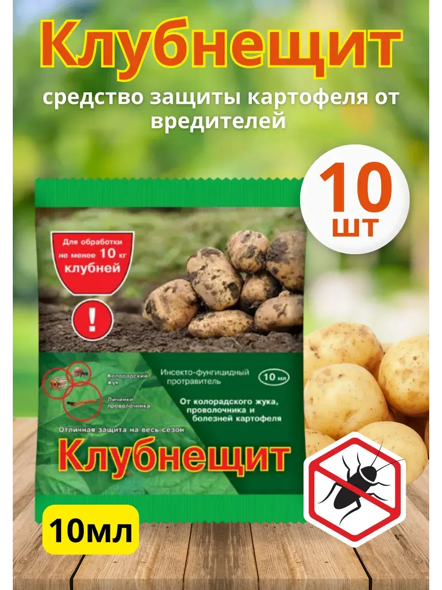 Клубнещит средство от колорадского жука, проволочника для протравливания клубней картофеля Клубнещит – это эффективный и экономичный препарат, предназначенный для обработки клубней картофеля перед посадкой. Объем флакона составляет 10 мл. Средство обеспечивает защиту картофеля от проволочника, колорадского жука, а также от многих болезней.