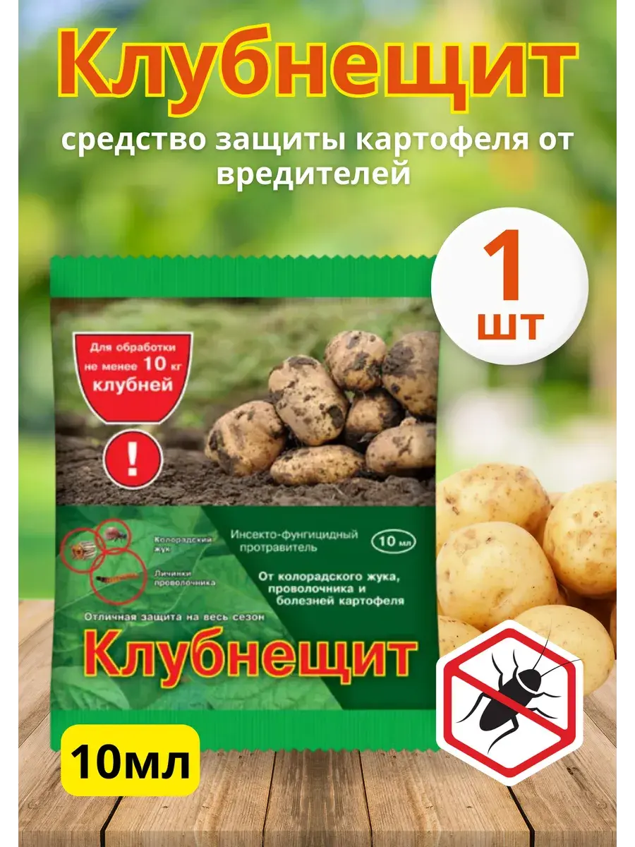 Клубнещит средство от колорадского жука, проволочника для протравливания клубней картофеля Клубнещит – это эффективный и экономичный препарат, предназначенный для обработки клубней картофеля перед посадкой. Объем флакона составляет 10 мл. Средство обеспечивает защиту картофеля от проволочника, колорадского жука, а также от многих болезней.