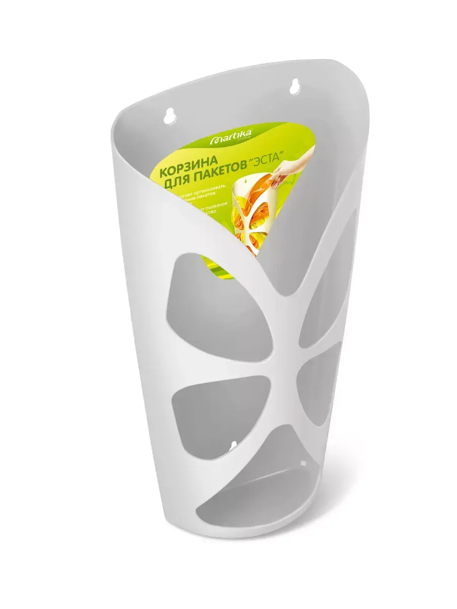 Корзина "Эста" поможет компактно и эстетично организовать хранение пакетов. Крепится с помощью двухстороннего скотча, который идет в комплекте. Или можно прикрутить на шурупы - на корзине имеются специальные отверстия для крепления на стену или дверцу шкафа.