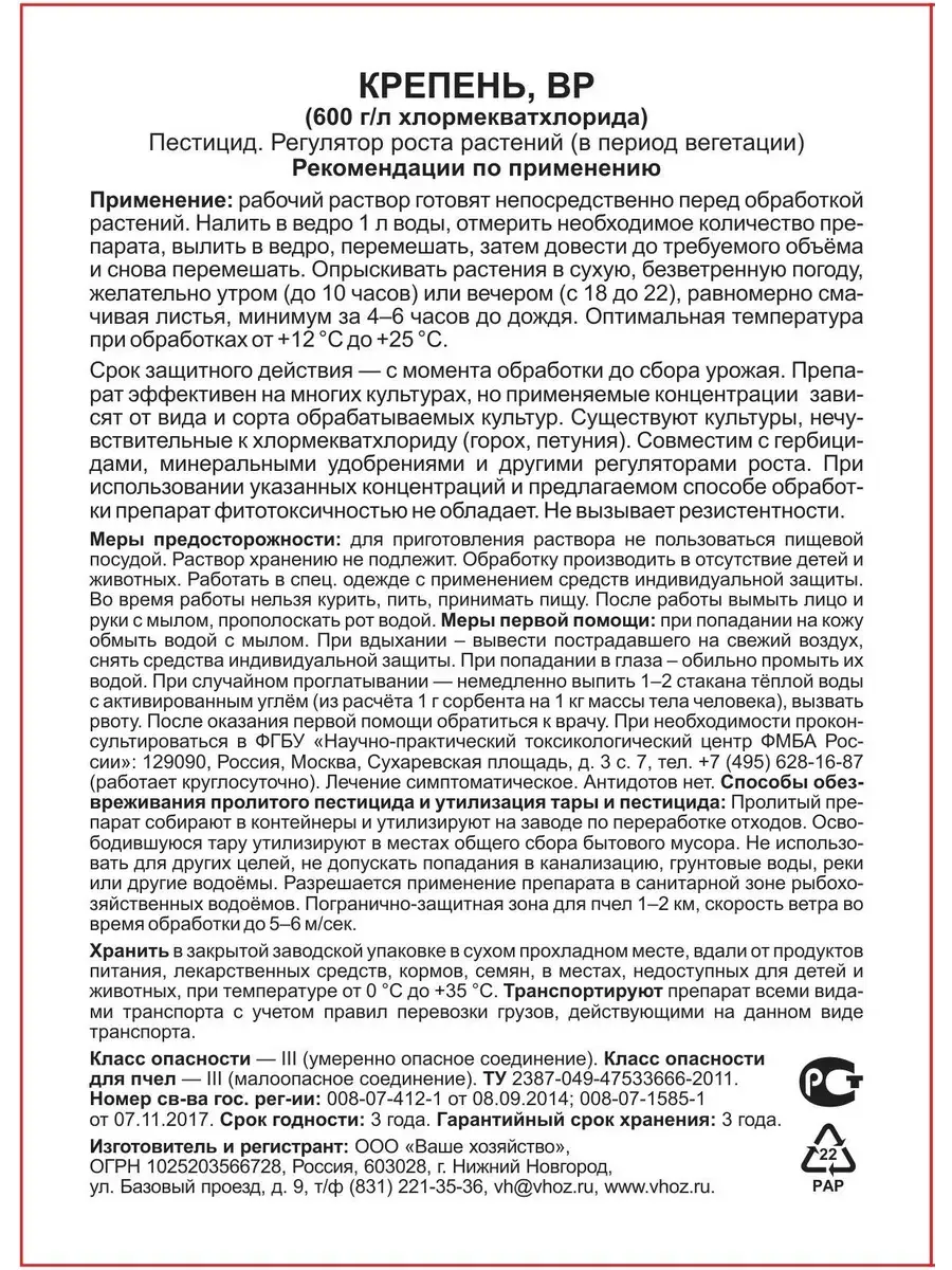 Состав препарата включает 600 г/л хлормекватхлорида. Срок годности составляет 3 года, что позволяет хранить “Крепень” до момента использования.