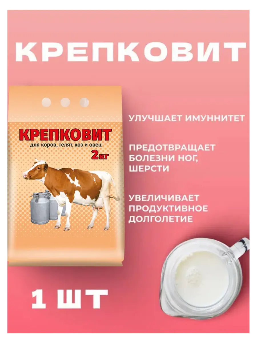 “Крепковит” для крупного рогатого скота 2кг - это кормовая добавка, которая способствует укреплению костной и мышечной системы, улучшению иммунитета и общего состояния здоровья животных. Она содержит необходимые витамины, макро- и микроэлементы, включая кальций, фосфор, цинк, йод, кобальт и другие. Особенно полезна добавка для молодых животных в период активного роста и для коров в период стельности и лактации, когда потребность в питательных веществах возрастает. Использование “Крепковита” помогает улучшить аппетит животных, увеличить их массу и повысить продуктивность. . Крепковит предотвращает болезни ног, костей и суставов, улучшает состояние кожи, шерсти и копыт, способствует хорошему состоянию зубов в течение жизни животного. Улучшает обмен веществ, пищеварение, работу кровеносной и эндокринной систем. Процессы старения животных идут медленнее, коровы и козы дольше сохраняют крепкое здоровье. Улучшаются воспроизводительные функции животных, коровы, козы и овцы быстрее и лучше идут в случку, а молодняк родится более крепким и здоровым.