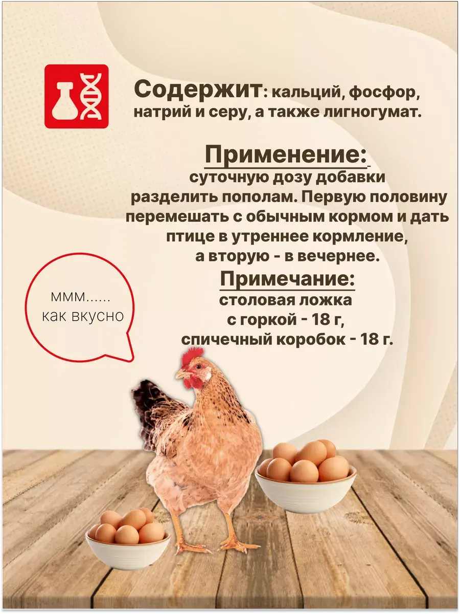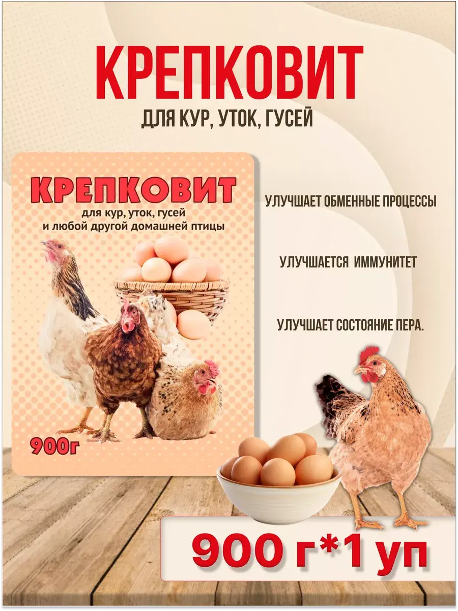 “Крепковит” - это кормовая добавка для кур, уток и гусей, которая помогает укрепить их костно-мышечную систему, повысить яйценоскость и мясную продуктивность, а также улучшить общее состояние здоровья. «Крепковит» - натуральный комплекс, разработанный специально для поддержания иммунной системы и общего благополучия птицы. Добавка в корм для кур несушек, уток, гусей «Крепковит», 900г. — кормовая добавка для нормализации минерального обмена у сельскохозяйственной птицы. «Крепковит» улучшает обмен веществ в организме, укрепляет иммунитет и устойчивость к стрессовым ситуациям. Предотвращает рахит, болезни ног и суставов, остеопароз, укрепляет костную ткань и улучшает состояние пера. Гарантирует крепкую и прочную скорлупу яиц, повышает яйценоскость. Благодаря использованию добавки в корм для куриц и корм для уток, улучшаются инкубационные свойства яиц, повышается выводимость птенцов. Птенцы и молодняк птицы быстрее растут и развиваются. Добавка в комбикорм для кур и комбикорм для уток богата витаминами, минералами и антиоксидантами, которые помогают повысить устойчивость организма к различным инфекциям и болезням. Регулярное применение «Крепковита» помогает птице справляться с неблагоприятными условиями, укрепляет ее иммунитет и снижает риск заболеваний. Способ применения: суточную дозу добавки разделить пополам. Первую половину перемешать с обычным кормом и дать птице в утреннее кормление, а вторую — в вечернее. В сутки на одну курицу нужно 3 г, уткам — 5 г в период покоя и 6-7 г в период высокой яйценоскости, гусям в непродуктивный период — 8 г на голову в сутки, а в период яйценоскости — 10-11 г. Примечание: столовая ложка с горкой — 18 г, спичечный коробок — 18 г. Гарантийный срок хранения: 24 месяца. Содержит: кальция- не менее 26,3%; фосфора - не менее 7 %; натрия - не менее 1,6 %; лигногумата - не менее 0,7 %.