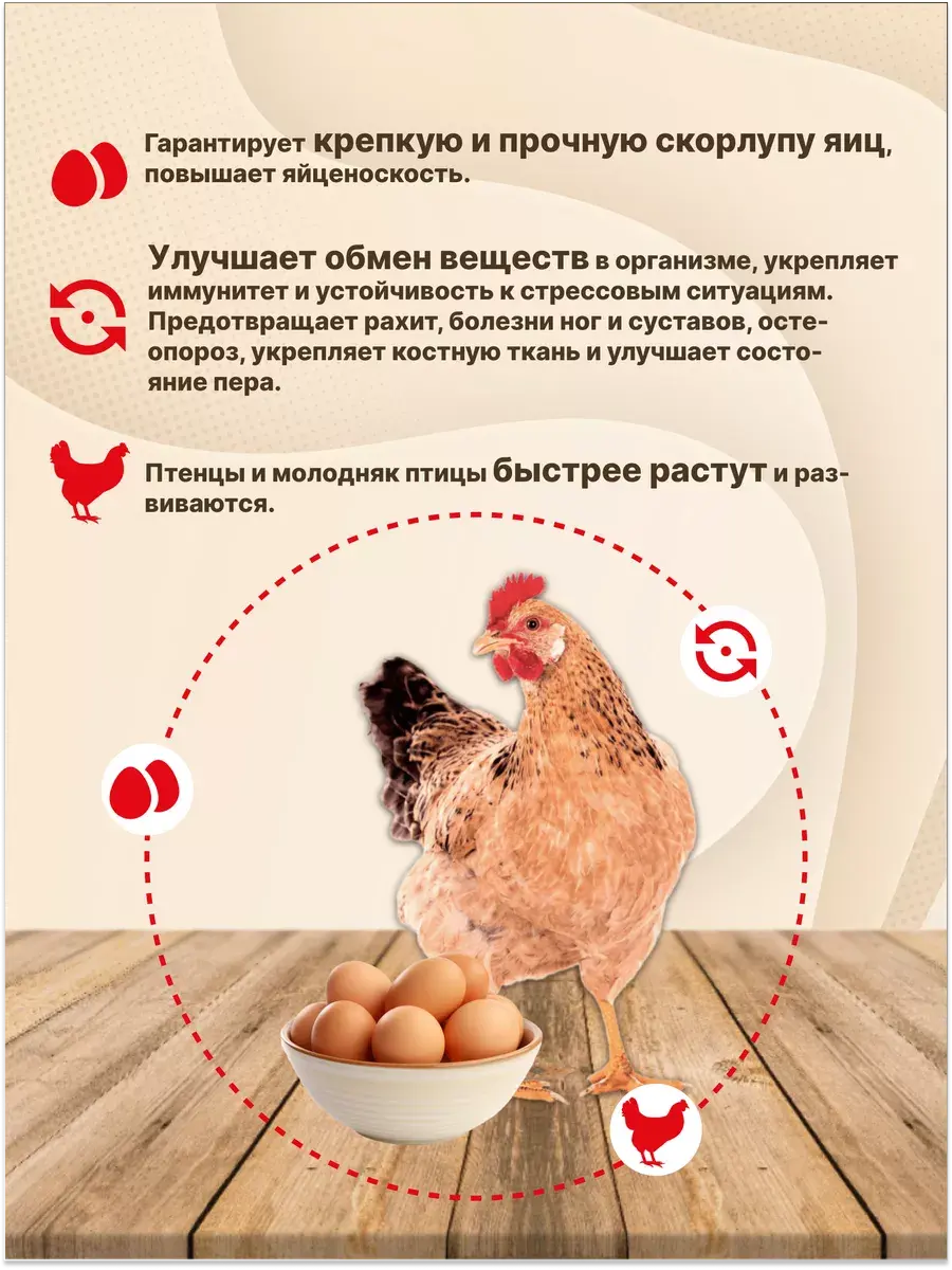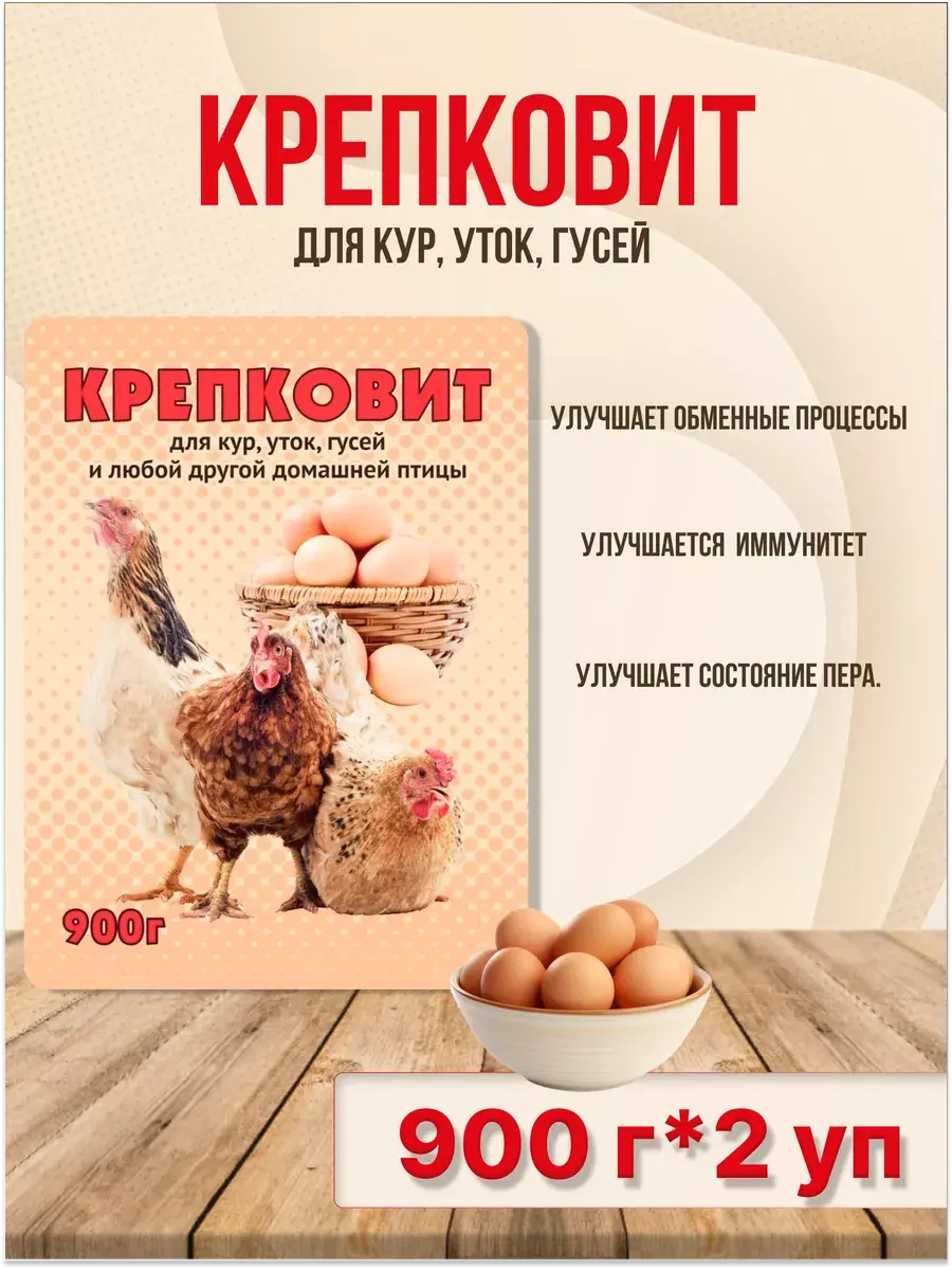 “Крепковит” - это кормовая добавка для кур, уток и гусей, которая помогает укрепить их костно-мышечную систему, повысить яйценоскость и мясную продуктивность, а также улучшить общее состояние здоровья. «Крепковит» - натуральный комплекс, разработанный специально для поддержания иммунной системы и общего благополучия птицы. Добавка в корм для кур несушек, уток, гусей «Крепковит», 900г. — кормовая добавка для нормализации минерального обмена у сельскохозяйственной птицы. «Крепковит» улучшает обмен веществ в организме, укрепляет иммунитет и устойчивость к стрессовым ситуациям. Предотвращает рахит, болезни ног и суставов, остеопароз, укрепляет костную ткань и улучшает состояние пера. Гарантирует крепкую и прочную скорлупу яиц, повышает яйценоскость. Благодаря использованию добавки в корм для куриц и корм для уток, улучшаются инкубационные свойства яиц, повышается выводимость птенцов. Птенцы и молодняк птицы быстрее растут и развиваются. Добавка в комбикорм для кур и комбикорм для уток богата витаминами, минералами и антиоксидантами, которые помогают повысить устойчивость организма к различным инфекциям и болезням. Регулярное применение «Крепковита» помогает птице справляться с неблагоприятными условиями, укрепляет ее иммунитет и снижает риск заболеваний. Способ применения: суточную дозу добавки разделить пополам. Первую половину перемешать с обычным кормом и дать птице в утреннее кормление, а вторую — в вечернее. В сутки на одну курицу нужно 3 г, уткам — 5 г в период покоя и 6-7 г в период высокой яйценоскости, гусям в непродуктивный период — 8 г на голову в сутки, а в период яйценоскости — 10-11 г. Примечание: столовая ложка с горкой — 18 г, спичечный коробок — 18 г. Гарантийный срок хранения: 24 месяца. Содержит: кальция- не менее 26,3%; фосфора - не менее 7 %; натрия - не менее 1,6 %; лигногумата - не менее 0,7 %.