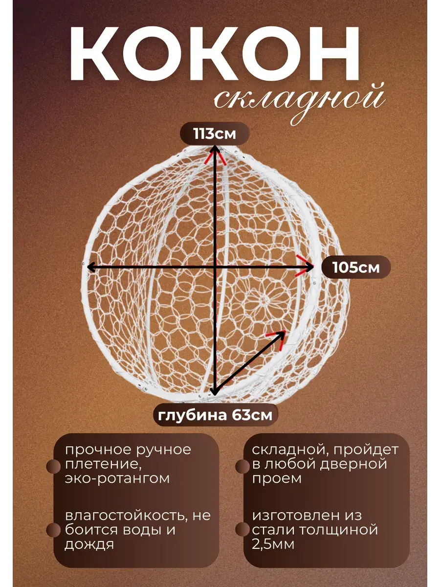 Качели идеально подходят для использования в качестве садового кресла, дачной мебели или уличной мебели из ротанга. Кресло можно разместить на балконе, террасе или веранде, а также в спальне и гостиной. Кокон качели станет вашим любимым местом для отдыха, привнося уют и стиль в ваш дом или сад.