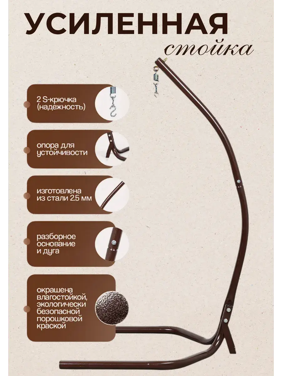 Качели подвесные изготовлены из высококачественных материалов,прочный металлический каркас обеспечивает долговечность и надежность конструкции. Сталь покрыта порошковой краской - не токсичной, устойчивой к различным погодным условиями и не подвержена коррозии. Кресло садовое выполнено из износостойкого искусственного ротанга, устойчивого к погодным условиям и ультрафиолетовому излучению, что делает его идеальным для использования на улице. Садовые качели взрослые не нуждается в специальном уходе, достаточно просто протереть влажной тряпочкой, что значительно облегчает эксплуатацию. В комплект кресло подвесное входит: 1) Сборно-разборная металлическая стойка. Конструкция выдерживает максимальную нагрузку до 240 кг. Высота стойки - 175 см. 2) Складной кокон. Размеры кокона: Высота-115 +-3 см, Ширина -100 +-3 см, Глубина - 63 +-3 см 3) Подушка в форме трапеция. Материал подушки - Оксфорд210, водоотталкивающая ткань. 4) Комплект креплений, который включает в себя: Анкерный болт, 3 болта М10х60, 5 гаек М10, 5 шайб М10, крючок, пружина, 2 болта М10х65 и 5 регулировочных опор.
