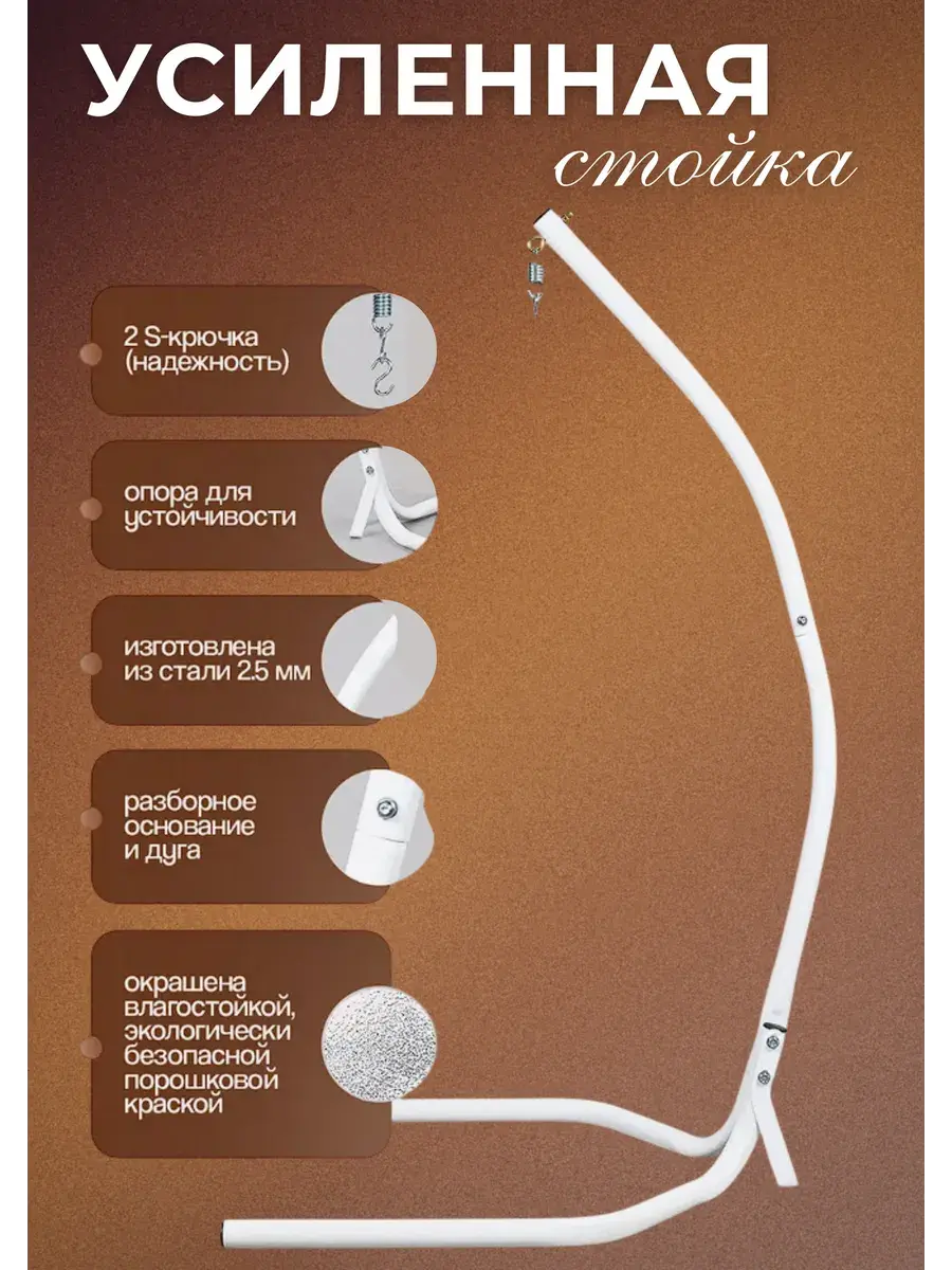 Качели подвесные изготовлены из высококачественных материалов,прочный металлический каркас обеспечивает долговечность и надежность конструкции. Сталь покрыта порошковой краской - не токсичной, устойчивой к различным погодным условиями и не подвержена коррозии. Кресло садовое выполнено из износостойкого искусственного ротанга, устойчивого к погодным условиям и ультрафиолетовому излучению, что делает его идеальным для использования на улице. Садовые качели взрослые не нуждается в специальном уходе, достаточно просто протереть влажной тряпочкой, что значительно облегчает эксплуатацию. В комплект кресло подвесное входит: 1) Сборно-разборная металлическая стойка. Конструкция выдерживает максимальную нагрузку до 240 кг. Высота стойки - 175 см. 2) Складной кокон. Размеры кокона: Высота-115 +-3 см, Ширина -100 +-3 см, Глубина - 63 +-3 см 3) Подушка в форме трапеция. Материал подушки - Оксфорд210, водоотталкивающая ткань. 4) Комплект креплений, который включает в себя: Анкерный болт, 3 болта М10х60, 5 гаек М10, 5 шайб М10, крючок, пружина, 2 болта М10х65 и 5 регулировочных опор.