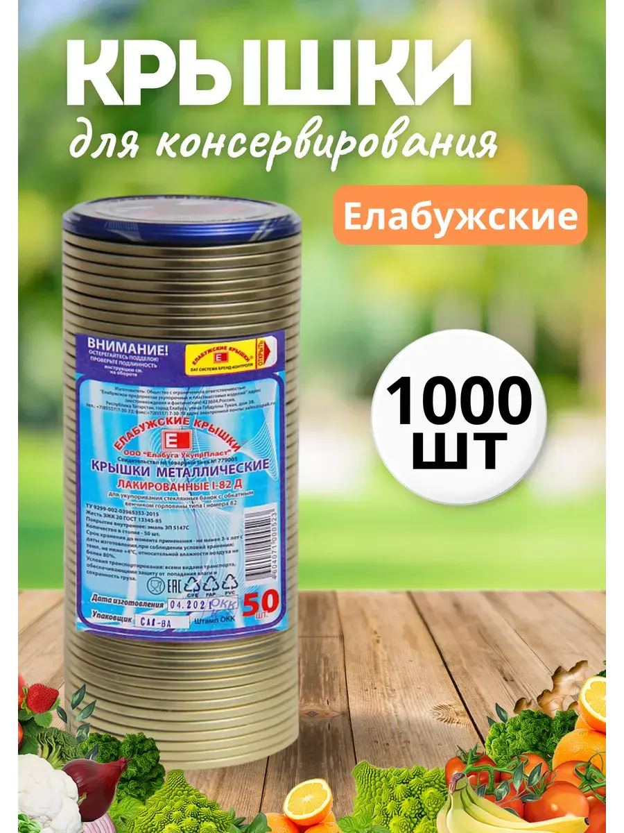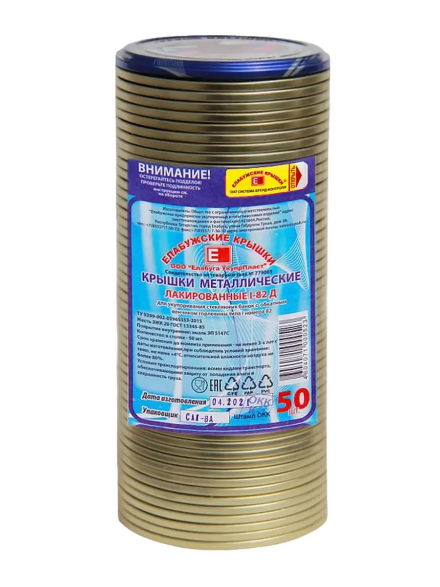 Крышки для банок металлические закаточные СКО 1-82 лак, 49+1шт. Крышки выпускаются в г. Елабуга под брендом «Елабужские крышки», изготовлены из пищевой белой жести, покрытая пищевыми лаками. полностью соответствует требованиям ГОСТ Р 51214-98, сертифицирована, прошла все необходимые санитарно-эпидемиологические исследования. Все материалы, применяемые при производстве крышки также сертифицированы. упакована в столбики по 50 шт. в термоусадочной плёнке с цветной верхней крышкой. Отлично использовать для герметичного закрытия горлышка стеклянной банки. Елабужские закаточные крышки для консервирования помогут хозяйке законсервировать любую продукцию. НЕ ПРЕДНАЗНАЧЕНЫ ДЛЯ АВТОКЛАВА! Крышки металлические для домашнего консервирования. Покрытие надежно защищает крышки от царапания во время консервирования, а так же на протяжении длительного срока препятствует образованию ржавчины при хранении консервов даже в условиях влажного погреба. Внутренняя поверхность крышек покрыта высокопрочным лаком, предназначенным для контакта с пищевыми продуктами. Это покрытие устойчиво к любым агрессивным средам (солёным, кислым, щелочным и т.п.) Заказывая Елабужские крышки для консервирования у нас Вы гарантированно получаете оригинальные крышки непосредственно с елабужского завода.