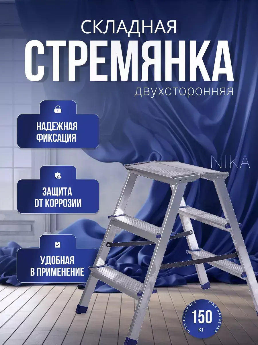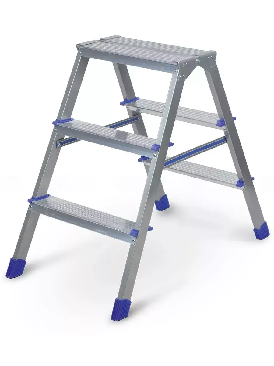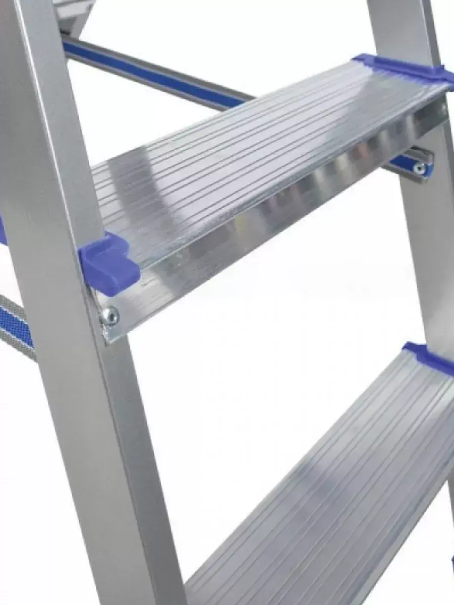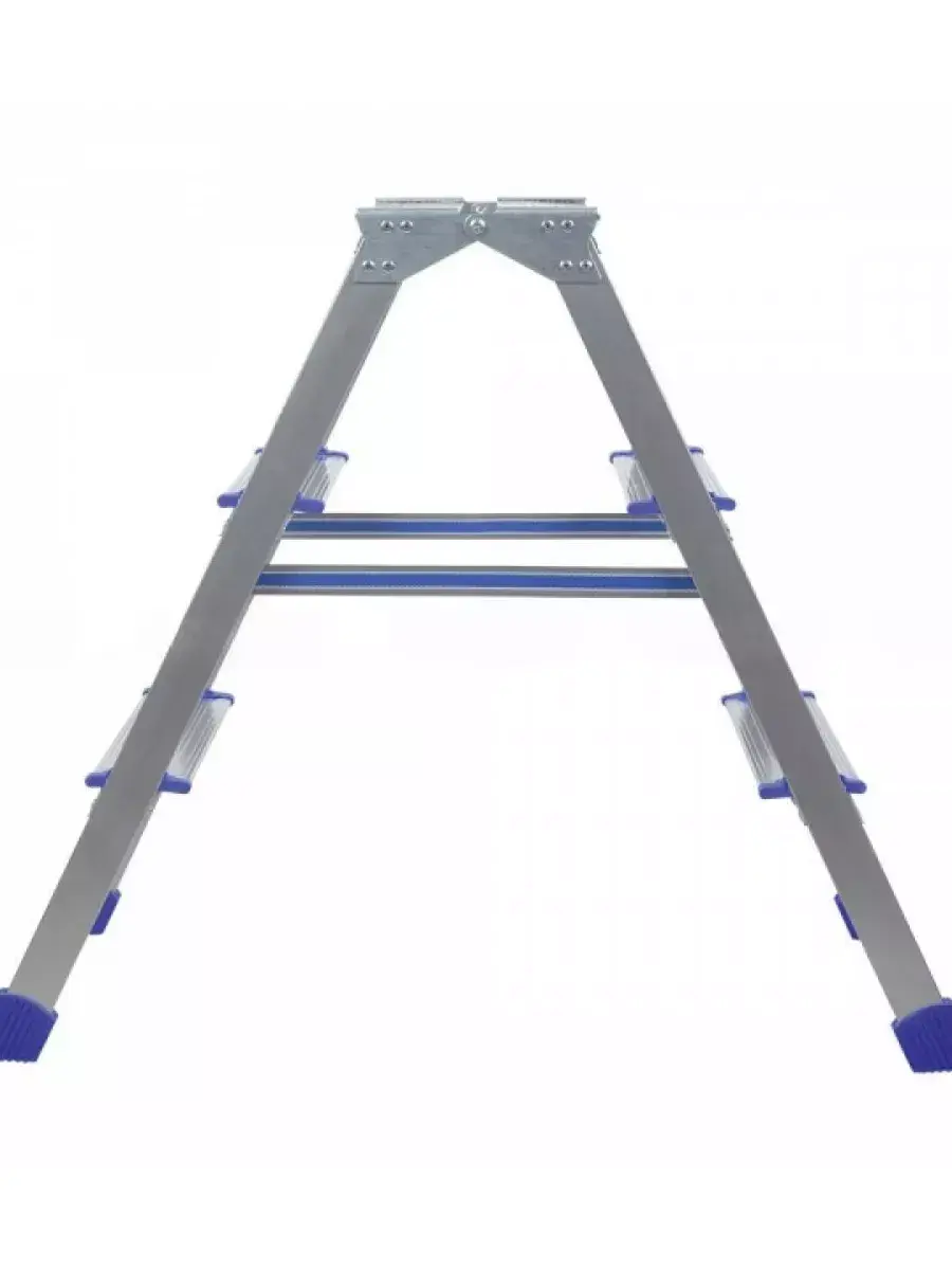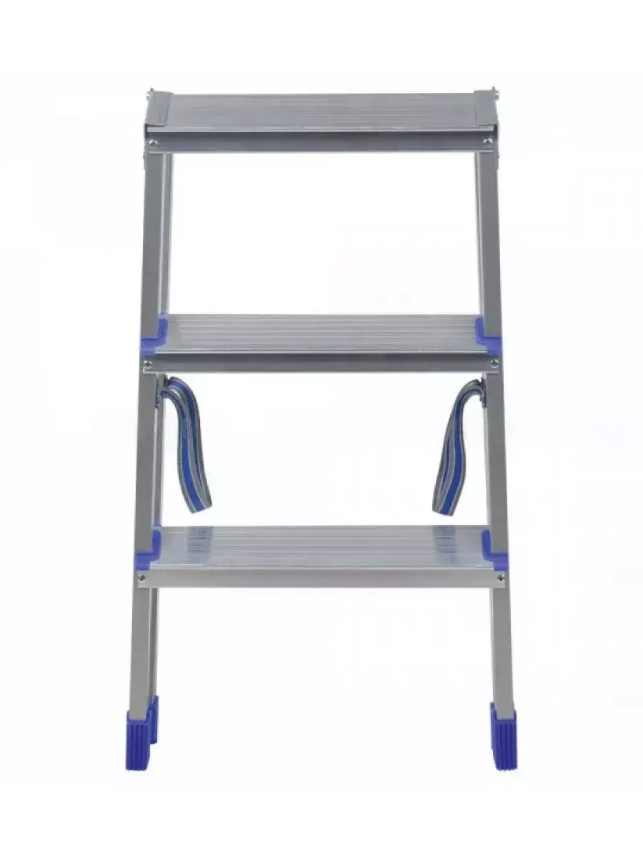 Стремянка двусторонняя алюминиевая Сибртех 97923 с 3 ступенями позволяет выполнять различные действия на высоте — штукатурить или красить стены, менять лампочки, вытирать пыль, доставать нужные предметы с верхних полок. Площадка находится на высоте 60,4 см от опорной поверхности, рабочая высота стремянки составляет 260,4 см (при среднем росте пользователя 170 см).Стремянку следует устанавливать на ровную плоскость. Работа с электроинструментом не допускается.ПреимуществаДолговечность — стремянка выполнена из легкого, но прочного алюминия, устойчивого к коррозии.Устойчивость к высоким нагрузкам — рама из прессованного алюминиевого профиля выдерживает до 150 кг.Продуманная конструкция — нейлоновые страховочные стяжки повышают надежность фиксации стремянки в рабочем положении.Комфорт и безопасность — широкие ступени удобны для длительной работы, а пластиковые накладки на них защищают пользователя от травм.Антискользящие свойства — ступени имеют рифленую поверхность.Защита напольного покрытия — опоры с пластиковыми рифлеными наконечниками не скользят и не оставляют царапин.Вес 2,4 кг — стремянку легко сможет установить пользователь с любым уровнем подготовки.Удобное хранение и транспортировка — размеры сложенной лестницы 660 х 435 х 160,5 мм.