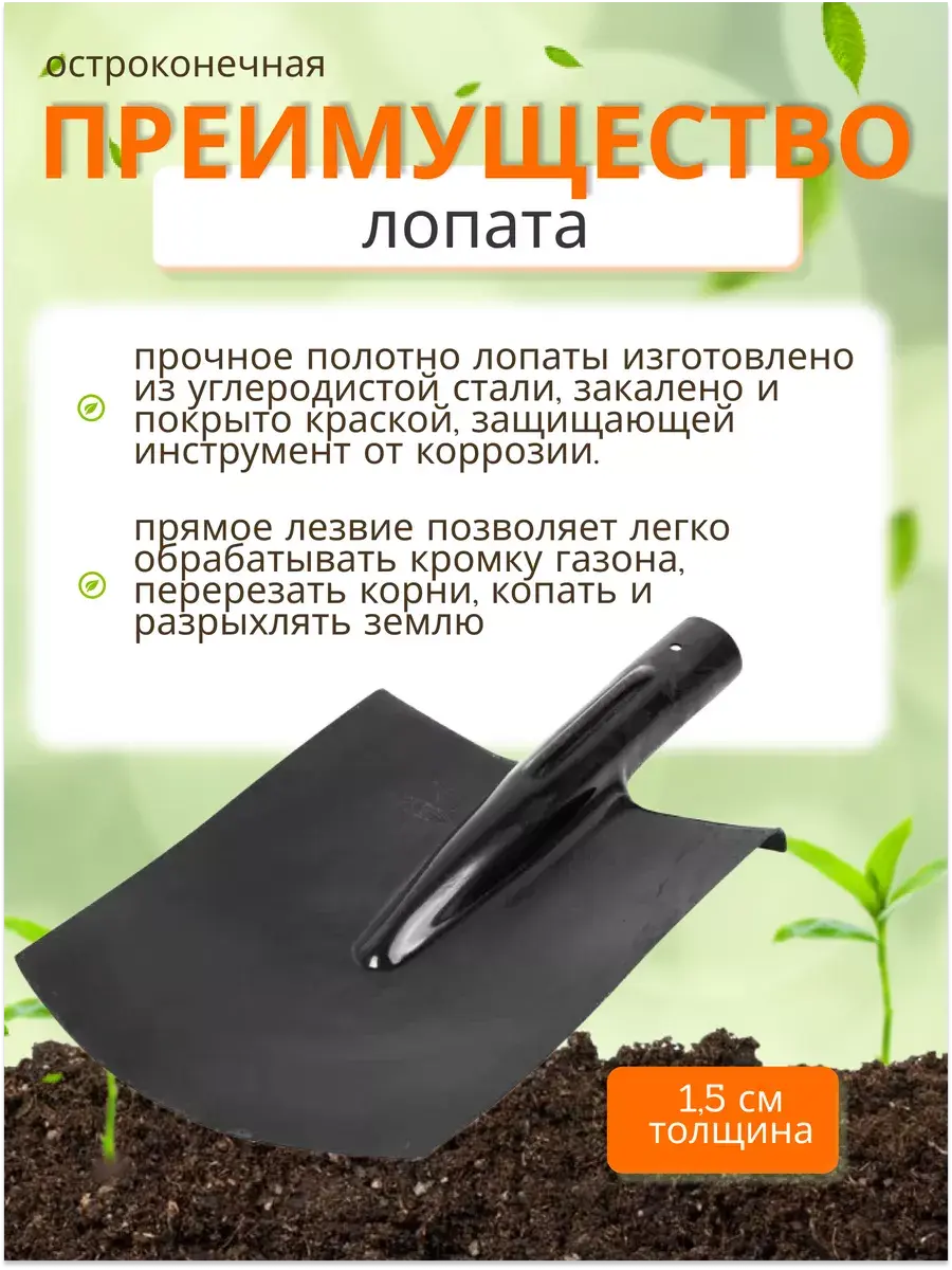 Лопата ЛКП-3 - это копальная инструмент, выполненный в форме прямоугольной лопаты. Она изготовлена из металла толщиной 1,5 мм, что обеспечивает прочность и долговечность инструмента при выполнении копательных работ.