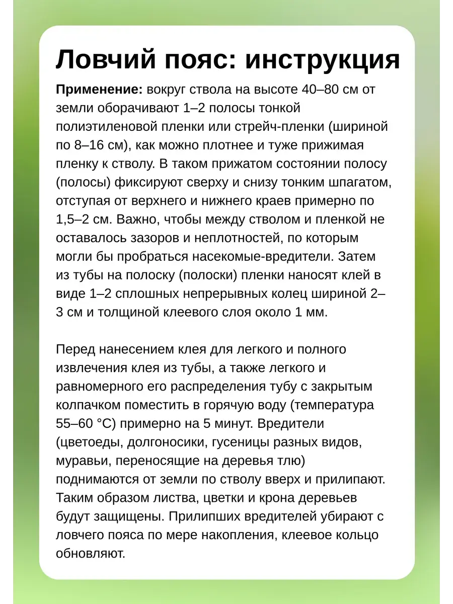 Длительный срок действия - нанесенный на стволы деревьев, клей сохраняет свои свойства до нескольких месяцев, обеспечивая надежную защиту от вредителей.