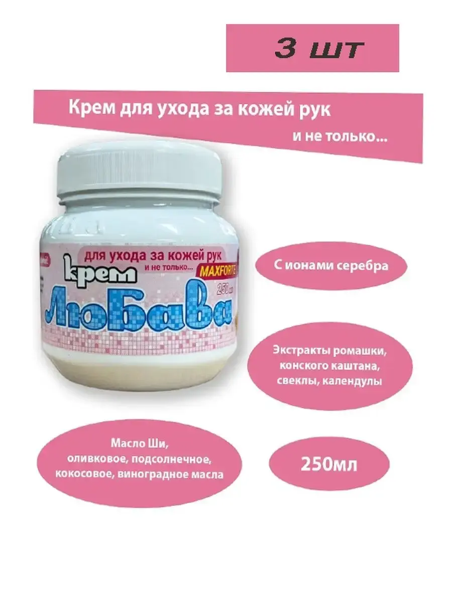 Крем Любава MAXFORTE насыщен ионами серебра, которые способны проникать в глубокие слои эпидермиса, нормализуя работу сальных желез и улучшая микроциркуляцию крови. В составе этого крема натуральные экстракты (ромашки, конского каштана, свеклы и календулы) и масла (масло ши, миндальное, пальмовое и соевое), они питают кожу, оказывают противовоспалительное, регенерирующее действие. Коллаген, входящий в состав крема Любава MAXFORTE, поддерживает эластичность кожи и предотвращает ее преждевременное старение, питает и увлажняет, устраняет сухость и шелушение, придает коже здоровый и ухоженный вид. Для ежедневного ухода за кожей рук и не только. Натуральные растительные масла, входящие в крем, насыщены витаминами молодости - A, E, F и D, которые отлично тонизируют кожу, дарят ей свежесть и сияние. Полезные жирные кислоты, микро- и макроэлементы в составе масел способствуют правильному функционированию клеток. Не содержит ароматизирующих отдушек и не перебивает аромат используемого парфюма. Способ применения: небольшое количество крема нанести на чистую, сухую кожу легкими массирующими движениями до полного впитывания.
