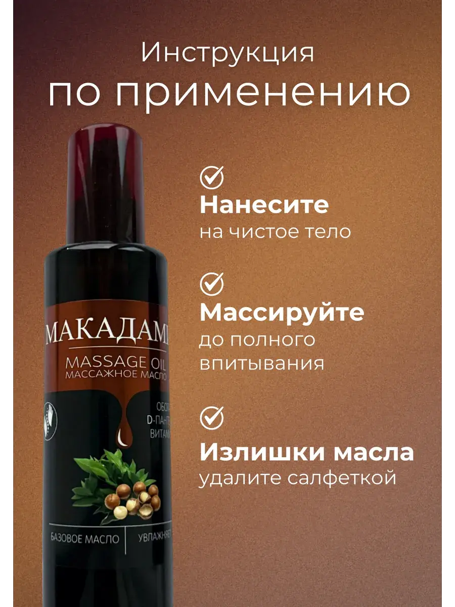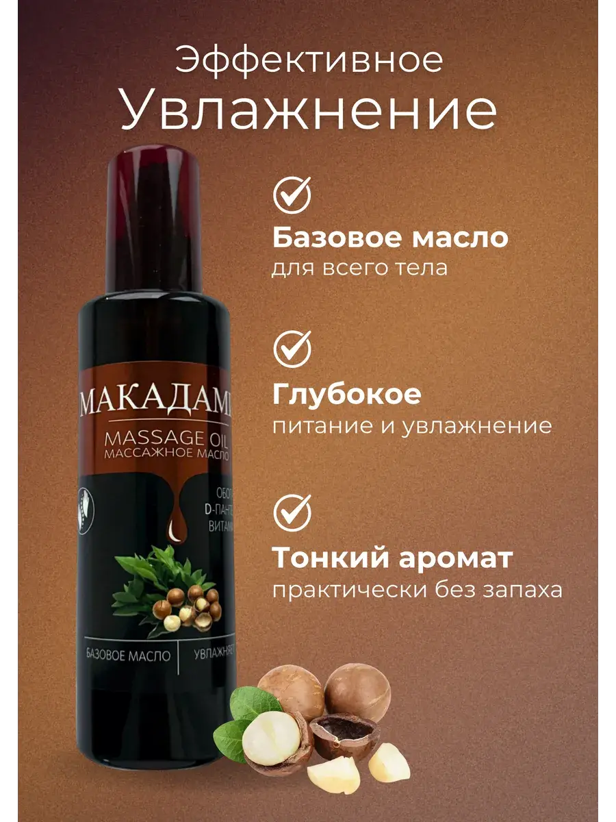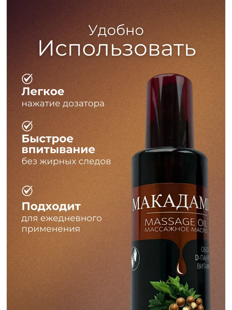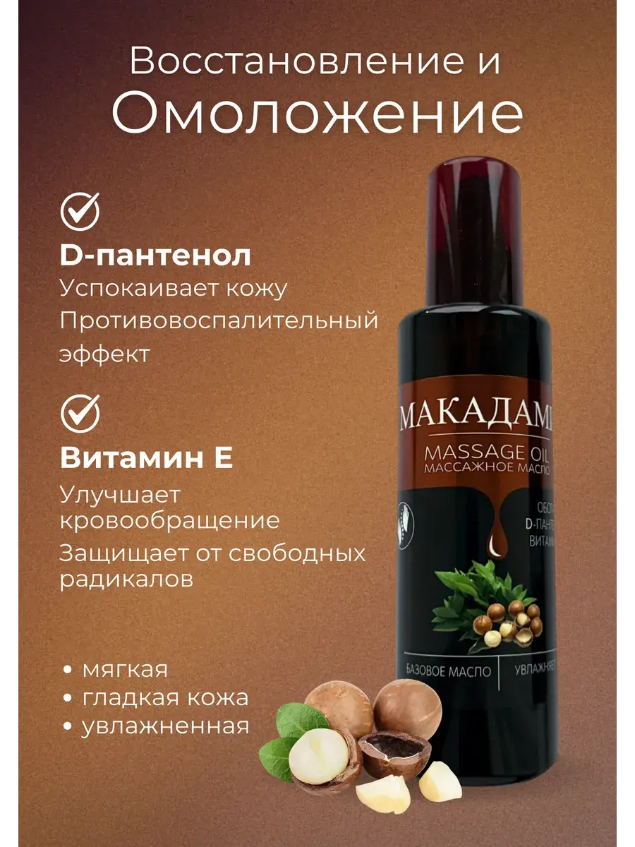 Масло для массажа тела и лица макадамия и пантенолом – это 100 % натуральное средство, идеально подходящее для ухода за телом. Оно обладает выразительными увлажняющими свойствами, которые помогут вам обрести мягкость и бархатистость кожи. Это масло является отличным вариантом не только для ежедневного применения, но и для расслабляющего или эротического массажа, погружая вас в атмосферу удивительного наслаждения.