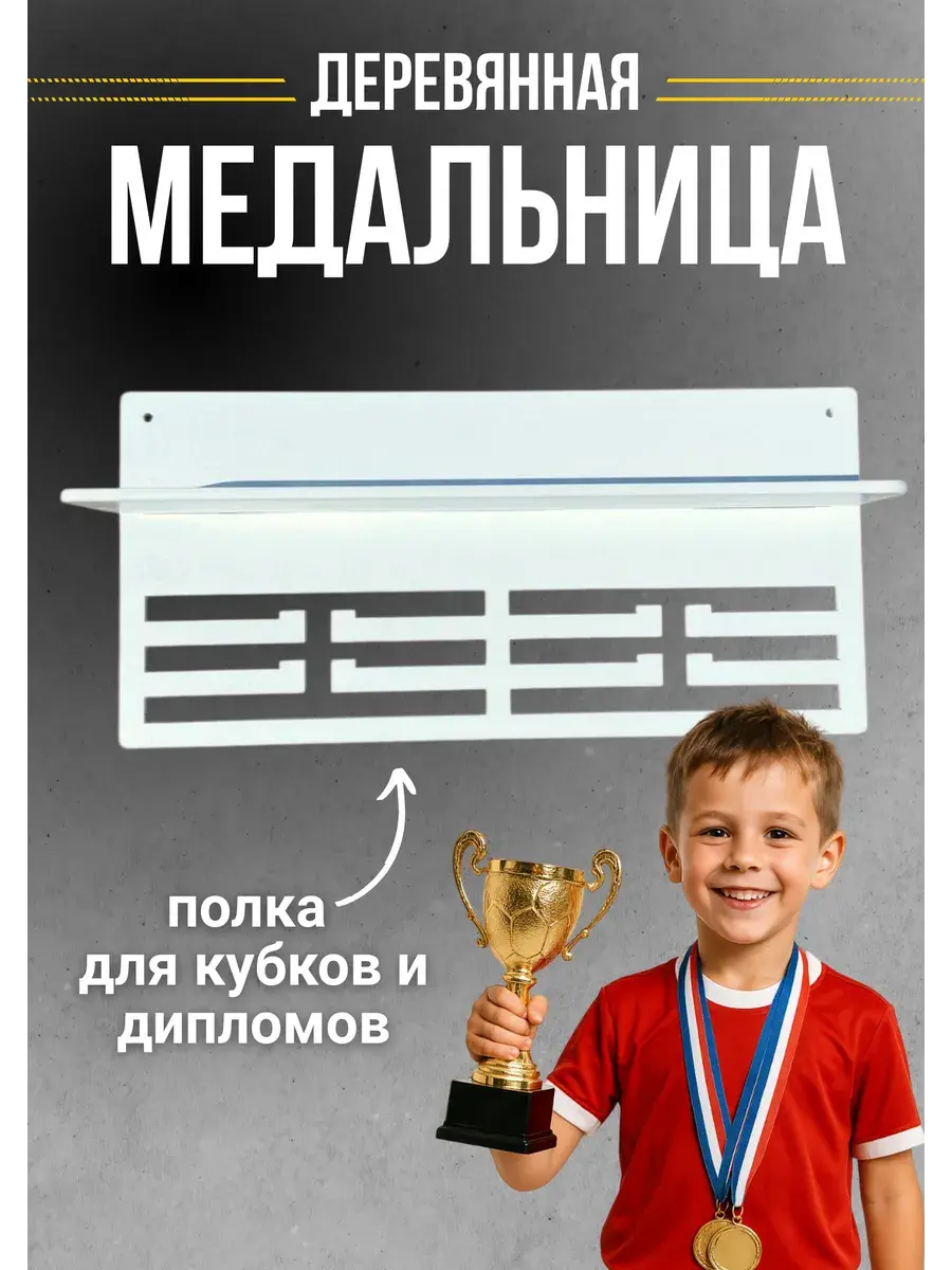 Эта медальница не только подчеркнёт ваши спортивные успехи, но и украсит интерьер. Изготовлена из прочного натурального дерева, она оснащена удобной полкой для кубков, грамот и памятных сувениров. Лаконичный дизайн впишется как в детскую комнату, так и в современный интерьер взрослого спортсмена.