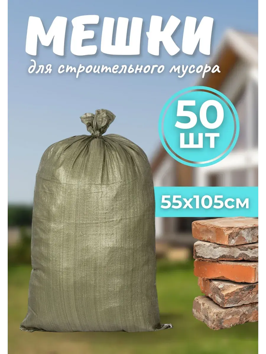 Мешки для строительного мусора, сбора листвы, переезда, сбора овощей, 55х105 см. Упаковка 50 штук. Мешки для строительного мусора – необходимый предмет при ремонтах, отделочных работах, на строительных объектах. Мешки не подходят для острого, колющего и режущего мусора. Они практичные, удобные, обладают высокой прочностью. Все эти качества способствуют их многократному использованию. Мешки изготовлены из полипропилена (ПП) и имеют плотную текстуру. Наши мешки имеют ряд преимуществ перед другими видами тары. Они прочные, устойчивы к воздействию влаги и химических веществ, а также легко моются и дезинфицируются. Кроме того, они не подвержены коррозии и не выделяют вредных веществ в окружающую среду, что делает их экологически чистыми.