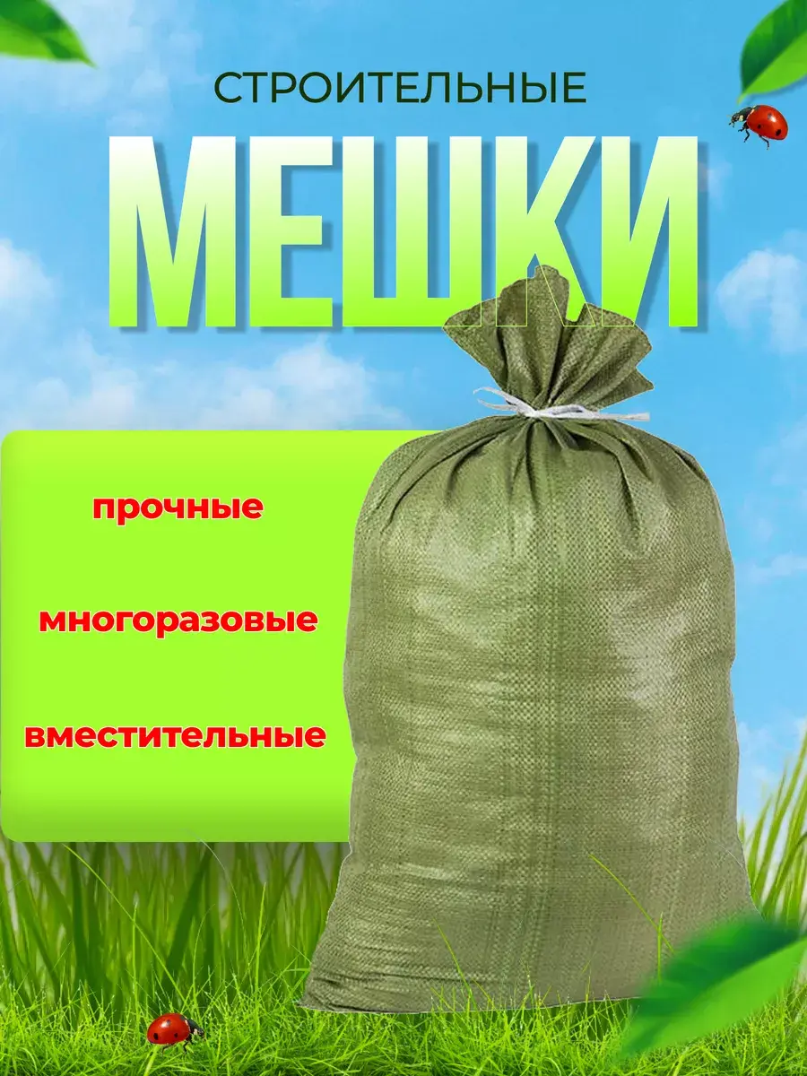Мешки для строительного мусора, сбора листвы, переезда, сбора овощей, 55х95 см. Упаковка 10 штук. Мешки для строительного мусора – необходимый предмет при ремонтах, отделочных работах, на строительных объектах. Мешки не подходят для острого, колющего и режущего мусора. Они практичные, удобные, обладают высокой прочностью. Все эти качества способствуют их многократному использованию. Мешки изготовлены из полипропилена (ПП) и имеют плотную текстуру. Наши мешки имеют ряд преимуществ перед другими видами тары. Они прочные, устойчивы к воздействию влаги и химических веществ, а также легко моются и дезинфицируются. Кроме того, они не подвержены коррозии и не выделяют вредных веществ в окружающую среду, что делает их экологически чистыми. Выдерживают вес до 50кг.