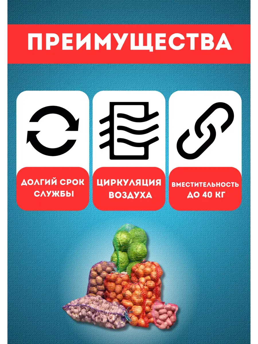 Внимание! Без выбора цвета (расцветки зеленые, красные, фиолетовые поступают рандомно) Сетка для овощей и фруктов будет незаменимым предметом в быту, на даче и огороде , деревенском доме. Хозяйственный мешок можно использовать для хранения картошки и огурцов , лука и капусты, перца и морковки, дров. Сетка мешок для овощей удобна при транспортировке, она прочная и легкая. Сетка для картошки хозяйственная ПВХ универсальна : она может использоваться для хранения и перевозки дров , спортивного инвентаря мячей и кеглей, а также игрушек . Удобно пользоваться такими мешками при переезде. В карточке представлены размеры сеток мешков овощных фиолетового, красного и зеленого цвета 50х80 до 40 кг , 45х75 до 30 кг и 25х39 до 5 кг . Сетка для овощей и фруктов - незаменимый предмет в быту , на даче , огороде , деревенском доме . Прочные мешки-сетки изготовлены из полипропилена. Они обычно используются для хранения таких овощей, как картошка, капуста, огурцы и лук, но могут использоваться и для других продуктов.Изготовлена из материалов высокого качества, что обеспечивает их долговечность и прочность. Одним из ключевых преимуществ является то, что она обеспечивает отличную вентиляцию для продуктов. Это помогает предотвратить порчу овощей, увеличивая их срок хранения. Кроме того, сетчатые мешки удобно носить в руках, что облегчает транспортировку продуктов.Упаковочная сеточка также может использоваться для хранения фруктов.