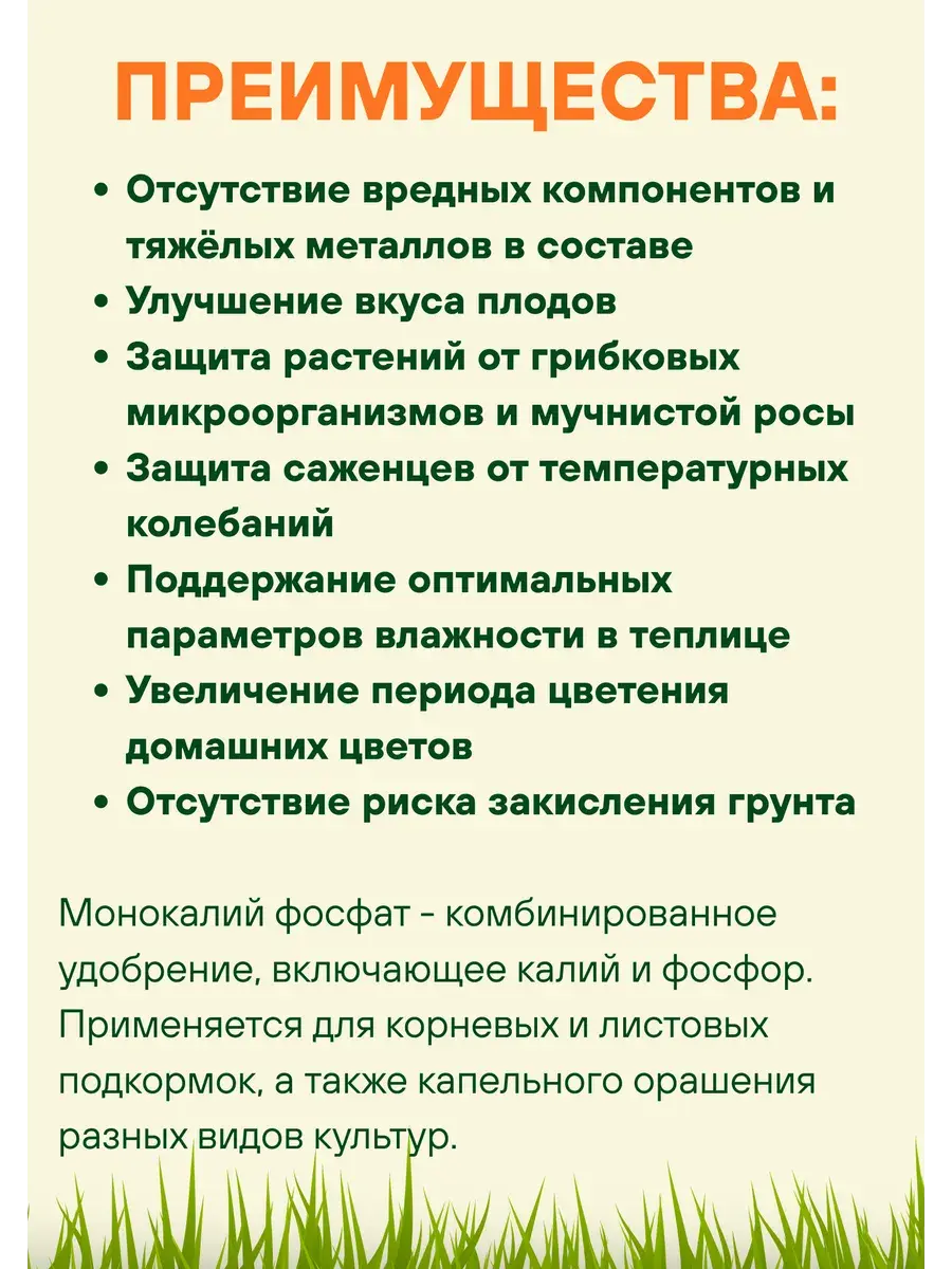 Универсальное средство для подкормки различных культур вашего сада или огорода. Монокалий фосфат - идеальное комплексное удобрение, которое обеспечит растения необходимыми питательными веществами: калий и фосфор для активного роста и развития рассады и взрослых растений.