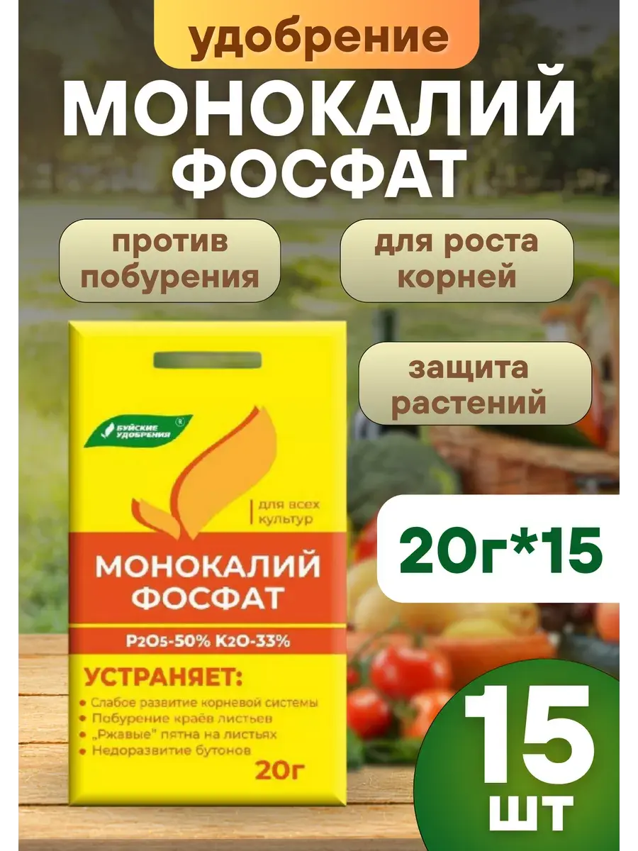 Водорастворимое удобрение монокалий фосфат для любых культур 20г применяется широко для корневых и внекорневых подкормок в закрытом и открытом грунте.
