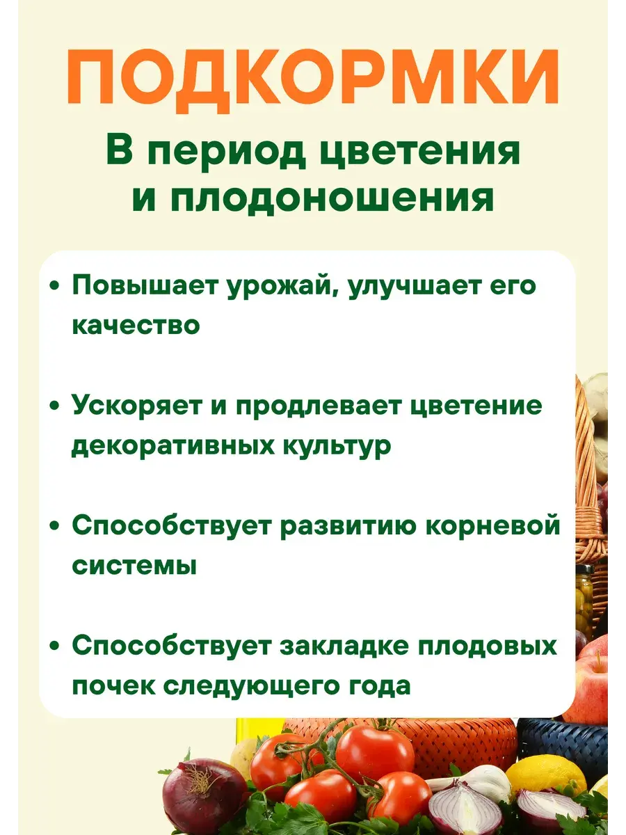 Способствует улучшению вкусовых качеств плодов и ягод; повышению сопротивляемости растений к неблагоприятным условиям. Снабжение растений необходимыми минералами помогает увеличить урожайность плодовых культур. Улучшает внешний вид цветов, продлевают период цветения.