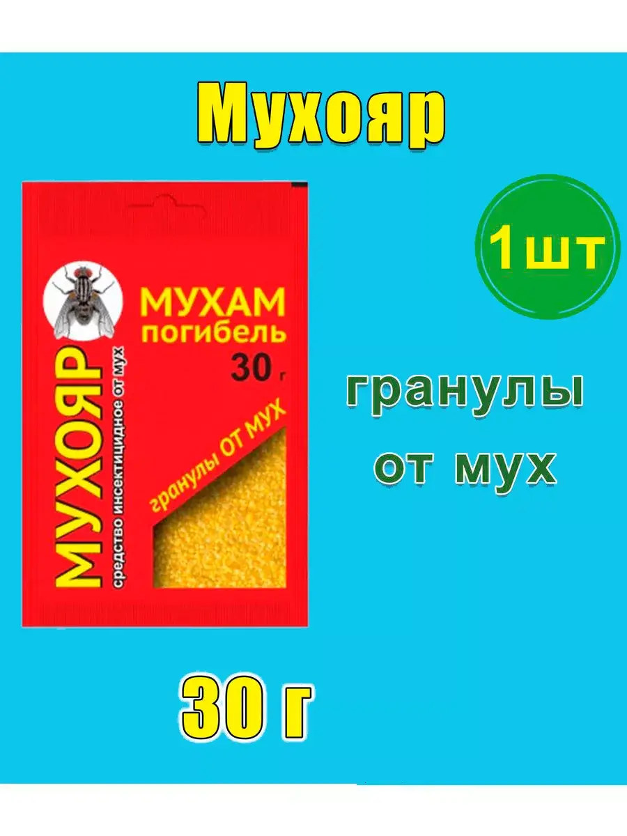 Мухояр от мух. Средство против мух насекомых.Насекомые вредители, летающие паразиты – распространенная проблема в доме и в саду! Средство против насекомых уничтожитель мух – «Мухояр — гранулы от мух» 30г. Инсектицидное средство в форме гранул желтого цвета для уничтожения мух в помещении. Метомил вызывает инсектицидный эффект, наличие в составе аттрактанта способствует охотному поеданию их мухами, а горький компонент битрекс защищает ее от поедания птицами и домашними животными. Инсектицидное средство «Мухояр — гранулы от мух» обладает острым инсектицидным действием по отношению к имаго мух и сохраняет свою активность в течении 2–3 месяцев. Способ применения: гранулы раскладывают на подложки (крышка, блюдце, которые не используются как пищевые) из расчета 2,5 г на 1 м² площади помещения. Расставляют приманки в местах наибольшего скопления мух: в местах фасовки и взвешивания, в производственных помещениях, на кухнях квартир жилых домов, на террасах, скотных дворах, хозяйственных постройках и т. д. Отраву приманку в течение периода ее действия можно переставлять в другие места, располагая там, где наблюдается наибольшая численность мух. Повторные обработки проводят при скоплении мух или постоянном залете их в помещение. Для более эффективной обработки помещения дополнительно рекомендуется произвести обмазку поверхностей, особо привлекательных для мух. Для этого необходимо смешать гранулы с водой в соотношении 1:1 (100 г приманки на 100 мл воды) и кисточкой произвести обмазку по периметру оконных и дверных проемов. Применяя ловушки от насекомых, средства от бытовых насекомых: средство от комаров на улице (спрей от насекомых; дихлофос; гель; спирали; аэрозоль; жидкость для фумигатора), дымовые шашки от ос; мошки; средство от тараканов и гранулы от муравьев, не стоит забывать о мухах. Для человека мухи опасны тем, что способны переносить возбудителей заболеваний. Но опасность также исходит и от опарышей. Болезнь, вызванная личинками мух, называется миаз.