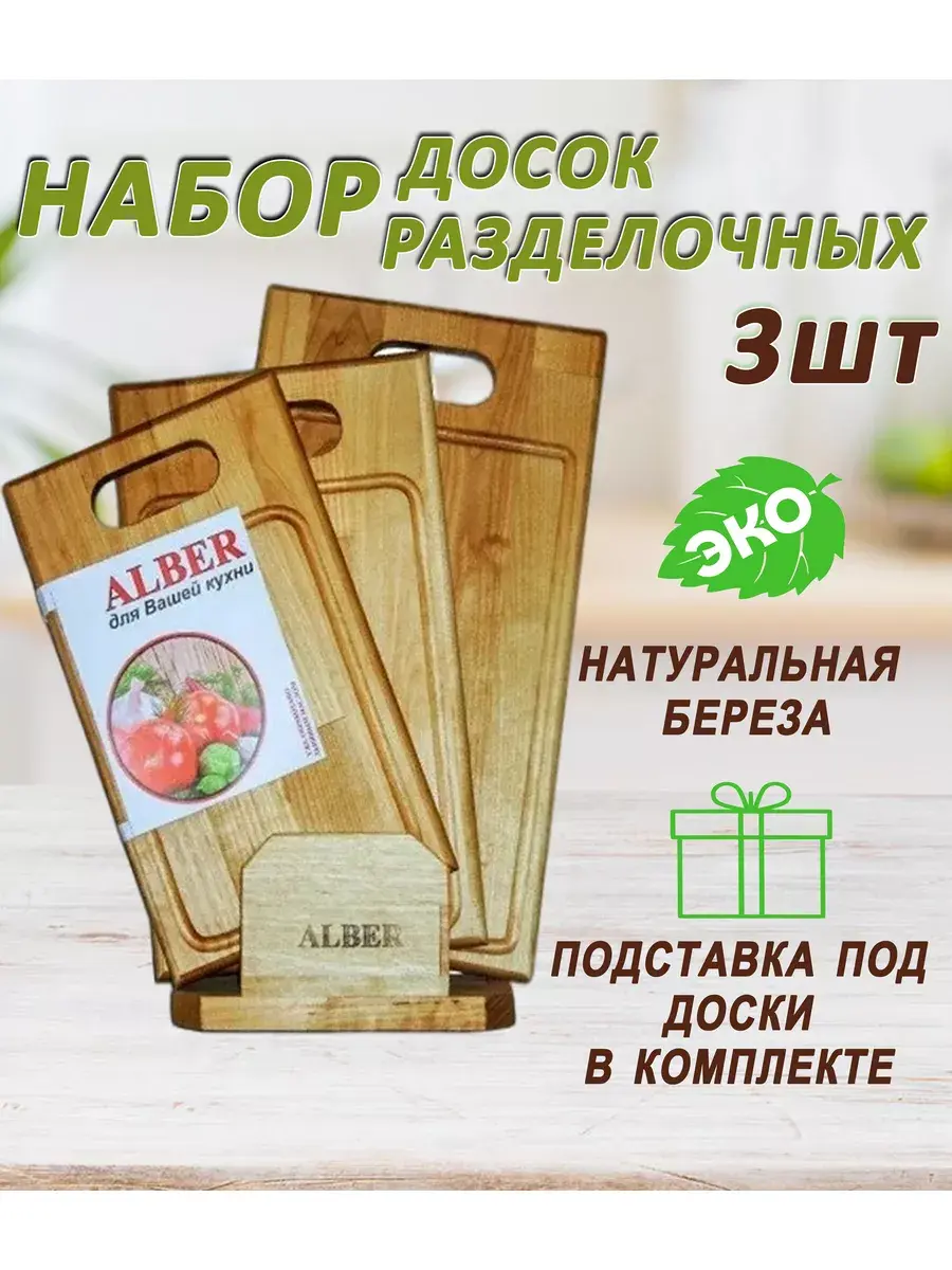 Набор разделочных досок состоит из 3х разделочных досок и подставки которые выполнены из высококачественной березы. Досочки не скользят и имеют оптимальную толщину.