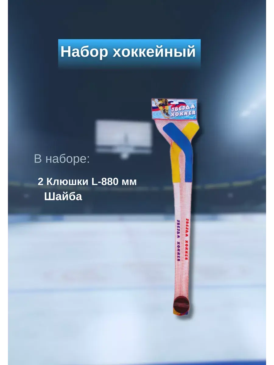 Набор хоккейного инвентаря, состоящий из двух клюшек длиной 88 см и шайбы. Предназначен для игры в хоккей на льду или на специальных площадках.