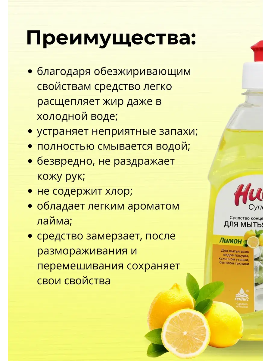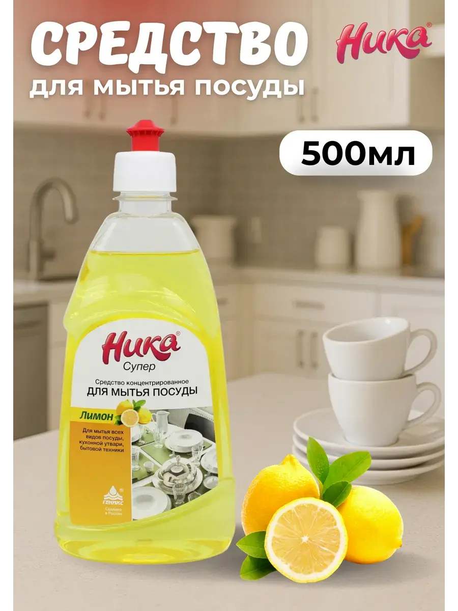 Концентрированное моющее средство для мытья посуды Ника-Супер плюс 0,5л используется для мытья посуды всех видов, предметов кухонного гарнитура, бытовой техники.Средство Ника-Супер плюс активно применяется в заведениях общепита, больницах, школах, детских садах, быту. Устраняет любые загрязнения и удаляет неприятные запахи, обладает обезжиривающим свойством и имеет выраженный запах лимона.Моющее средство для посуды Ника-Супер плюс не оказывает раздражающего эффекта, не сушит кожу и не содержит в своем составе хлор. Срок годности 24 месяца.