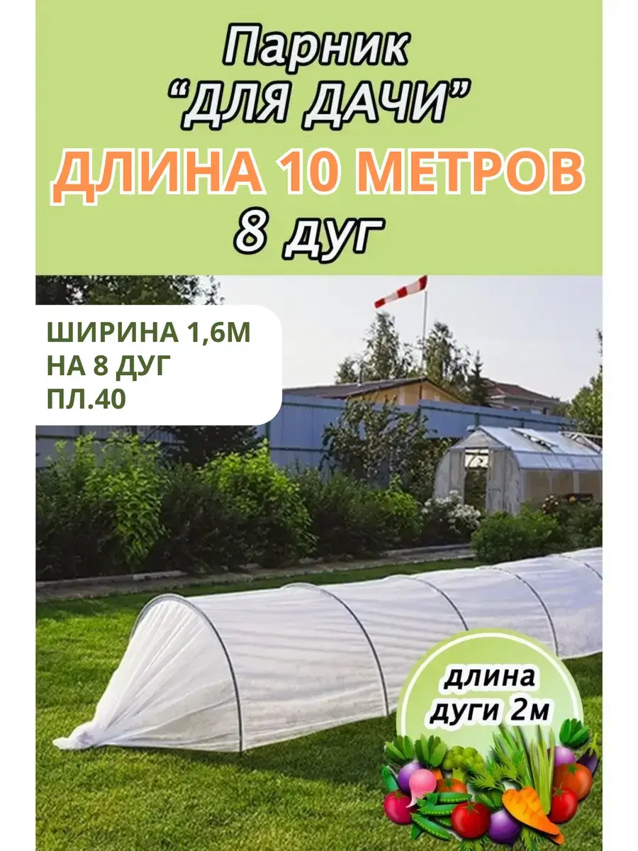 Парник садовый №40 длина 8м (комплект: ПВХ дуги 2м - 8шт, укрывной материал №40, ширина 1,6м, длина 10м). Удобный и качественный парник для рассады помогает увеличивать урожай! Парник для дачи уменьшает нормы полива, домашняя тепличка создает благоприятный климат. Продлевает период вегетации. Защищает от сильных осадков, от ночных заморозков, от насекомых и вредителей. Быстрая установка. Долгий срок службы. Парничок для растений в горшках, ранних овощных культур с высадкой в грунт. Укрывной материал защищает вашу рассаду от вредителей и погодных условий. Этот парник-теплица является идеальным выбором для домашнего сада или огорода. Для укрывания грядок и растений в холодное время года, парник может использоваться как укрывной материал.