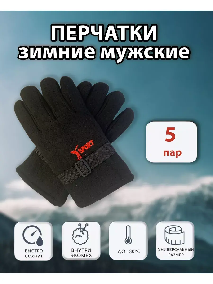 Ветрозащитные Перчатки зимние мужские флисовые СПОРТ предназначены для уличных работ в холодное время года, для активного отдыха, а также охоты и рыбалки. Удерживают тепло даже при самых низких температурах - до минус 30°С. Имеют регулировочный ремешок на манжете. Поставляются в индивидуальной упаковке. Тёплые, прочные перчатки для зимних видов спорта изготовлены из флисовой ткани. Цвет: чёрный. Размер: универсальный. Мужские флисовые перчатки для зимних видов спорта.