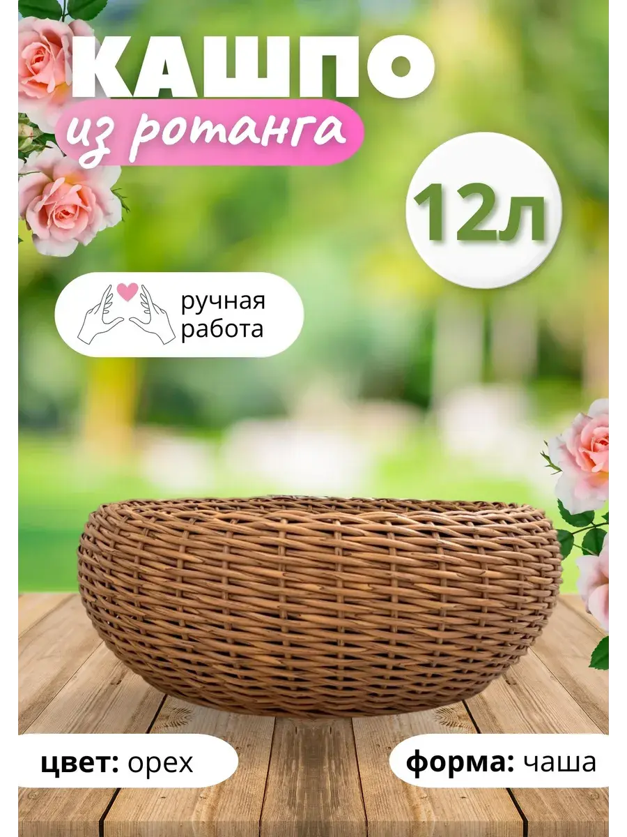 Плетёное кашпо из ротанга станет стильным и практичным украшением для вашего интерьера или сада. Его форма и вместительный объем идеально подходят для выращивания различных растений, от пышных цветов до компактных кустарников. Кашпо выполнено из прочного материала, который устойчив к воздействию влаги и солнечных лучей. Его натуральный цвет гармонично впишется в любой дизайн, создавая уютную и теплую атмосферу. Ручная работа - идеально подойдет для подарка.