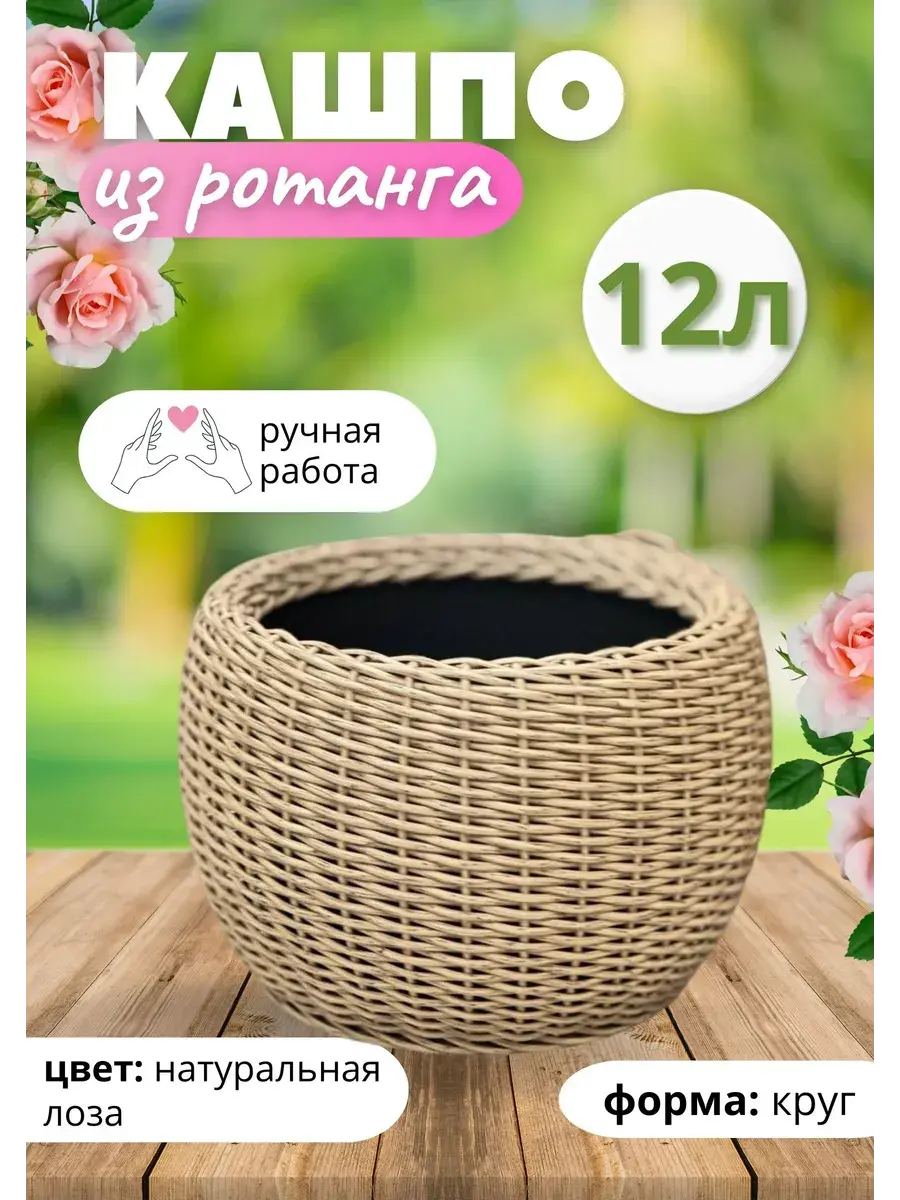 Плетёное кашпо из ротанга станет стильным и практичным украшением для вашего интерьера или сада. Его форма и вместительный объем идеально подходят для выращивания различных растений, от пышных цветов до компактных кустарников. Кашпо выполнено из прочного материала, который устойчив к воздействию влаги и солнечных лучей. Его натуральный цвет гармонично впишется в любой дизайн, создавая уютную и теплую атмосферу. Ручная работа - идеально подойдет для подарка.