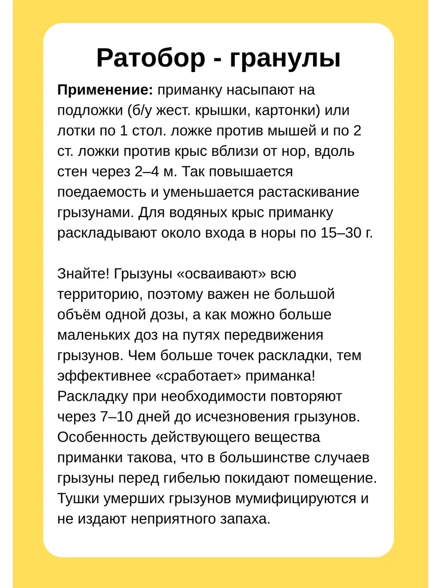 Гранулы от крыс и мышей Ратобор (100г пакет) мумифицирующие. Отрава предназначена для борьбы с серыми и черными крысами, домовыми и полевыми мышами, водяными крысами. Препаративная форма (твердые гранулы) в отличие от большинства аналогов характеризуется повышенной устойчивостью к размыканию, гранулы не ломаются, не крошатся, длительное время сохраняют привлекательность для грызунов и родентицидные свойства. Введение в состав нескольких пищевых привлекателей гарантирует высокую поедаемость всеми видами грызунов с различными пищевыми предпочтениями. Действующее вещество распределено равномерно по всей толщине гранулы, что исключает его неэффективные потери. Может применяться в саду, в открытых и влажных норах. Тушки умерших грызунов мумифицируются и не издают неприятного запаха. Мощный крысиный яд обеспечит результат, грызуны погибают после однократного поедания. Средство эффективное, но можно использовать в комплексе с клеем от мышей Альт или Котофей. Срок годности 36 месяцев.