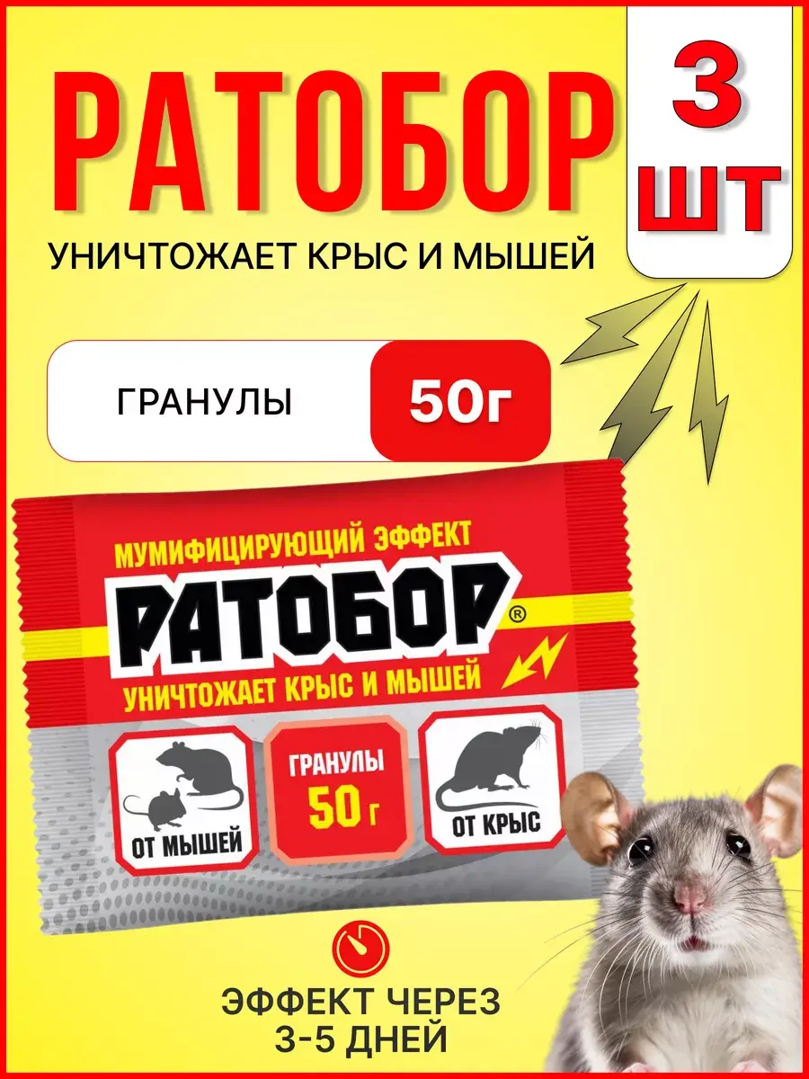 Отрава для мышей и крыс Гранулы Ратобор 50г -3шт