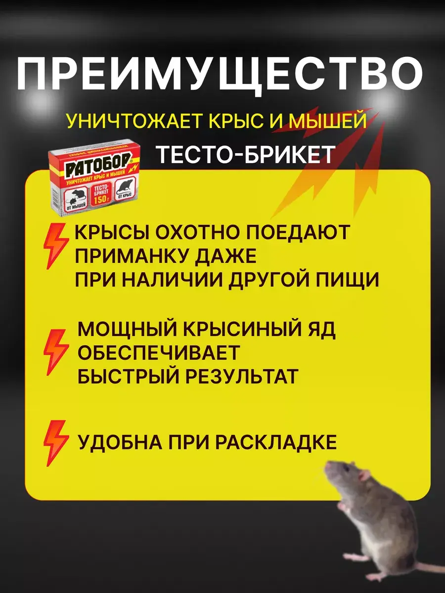 Отрава для мышей. Средство защиты грызунов Ратобор . Отрава предназначенная для крыс мышей. Приманка от грызунов имеет притягательный вкус и запах ,тем самым притягивая грызунов. Против крыс особенно эффективен Ратобор тесто-брикет. Отрава от мышей, известная также как средство от крыс и мышей, является эффективным средством борьбы с грызунами в доме. Это особенно полезно для частных домов, где присутствие мышей и крыс может быть особо проблематичным. Крысиная смерть - это яд, применяемое для уничтожения грызунов. Оно обеспечивает быстрый и безболезненный способ избавления от вредителей. Смерть грызунам отрава является эффективной альтернативой другим способам борьбы с вредителями, таким как мышеловки или ловушки. Приманка для крыс и мышей представляет собой привлекательное средство, разработанное для привлечения и устранения грызунов. Она может быть размещена в мышеловках или капканах для улова и уничтожения грызунов. Такая приманка чистит дом от крыс и предотвращает их повторное появление. Отрава от грызунов с мумифицирующим эффектом является еще одним вариантом применения яда для уничтожения мышей и крыс. Она обеспечивает не только быстрое и безболезненное истощение вредителей, но и мумификацию их тел. Это позволяет уменьшить мертвый запах и риск возникновения инфекций от грызунов.В целом, применение средств от крыс и мышей в частном доме является важным аспектом поддержания чистоты и гигиены. Выведение грызунов из дома помогает предотвратить повреждение имущества и возможные риски для здоровья людей и домашних животных. Для них он оказывается привлекательнее другого корма, и даже если поблизости есть иные источники пищи, крысы выбирают приманку. Тесто-брикет изготовлен в виде небольших таблеток, каждая из которых находится в индивидуальной упаковке. Оболочку нужно снять и поместить приманку в местах, привлекательных для крыс.