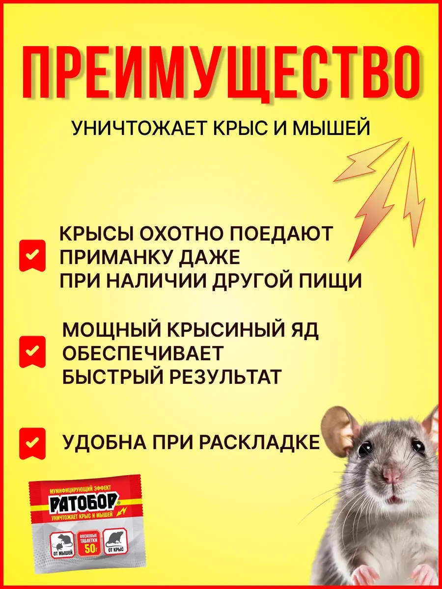 Таблетки восковые Ратобор, от мышей и крыс, 50 г. Восковые таблетки Ратобор - один из лучших препаратов, эффективен и против крыс, и против мышей. Приманка удобна при раскладке. Отрава идеально подходит для борьбы с грызунами в саду, на огороде, в погребе, в сырых и влажных местах. Дольше других препаратов сохраняет свою эффективность, находясь длительное время в местах раскладки. Тушки умерших грызунов мумифицируются и не издают неприятного запаха. Применение: таблетки раскладывают на подложки (б/у жестяные крышки, картонки) или в лотки по 1 шт. против мышей и по 1-2 шт. против крыс вблизи от нор, вдоль стен и перегородок через 2-4 метра.
