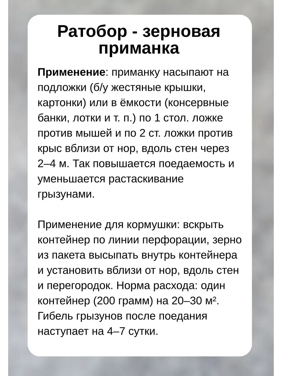 Приманка зерновая "Ратобор", от мышей и крыс, 200 г (zip lock). Зерновая приманка. Охотно поедается крысами и мышами, легко распределяется грызунами между собой. Зерно для грызунов - корм привычный, поэтому начало поедания приманки грызунами после раскладки очень быстрое. Легко распределяется грызунами между собой. Тушки умерших грызунов мумифицируются и не издают неприятного запаха. Применение: приманку насыпают на подложки (б/у жестяные крышки, картонки) или в ёмкости (консервные банки, лотки и т. п.) по 1 стол. ложке против мышей и по 2 ст. ложки против крыс вблизи от нор, вдоль стен через 2–4 м. Так повышается поедаемость и уменьшается растаскивание грызунами. Знайте! Грызуны «осваивают» всю территорию, поэтому важен не большой объём одной дозы, а как можно больше маленьких доз на путях передвижения грызунов. Чем больше точек раскладки, тем эффективнее «сработает» приманка! Раскладку при необходимости повторяют через 7–10 дней до исчезновения грызунов. Тушки умерших грызунов мумифицируются и не издают неприятного запаха. Гарантийный срок хранения: 2 года.