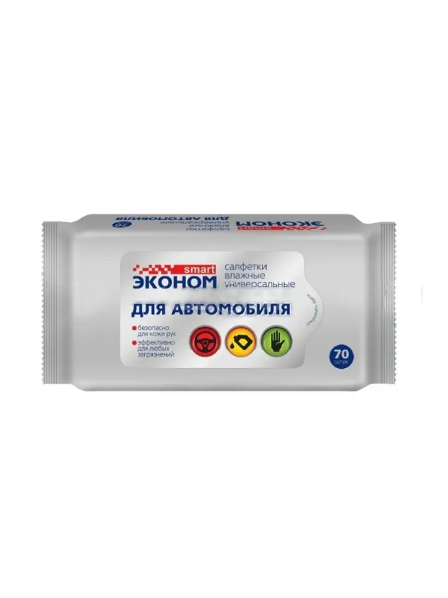 Влажные салфетки Smart Эконом для автомобиля, 70 шт. Салфетки влажные Smart Эконом универсальные для автомобиля 70шт созданы, чтобы обеспечить качественную уборку внутри салона автомобиля. Салфетки изготовлены из мягкого и экологичного нетканого полотна и пропитаны очищающим лосьоном, который в упаковке из плотного полиэтилена долгое время остается активным. Салфетки отлично очищают пластиковые поверхности от грязи и пыли, восстанавливают их оригинальный цвет, не оставляют разводов и обеспечивают долговременный антистатический эффект. Кроме того, салфетки эффективно очищают кожу рук от различных технических загрязнений, таких как бензин, мазут, машинное масло, копоть. Они не раздражают кожу рук и не оставляют чувства липкости после использования.