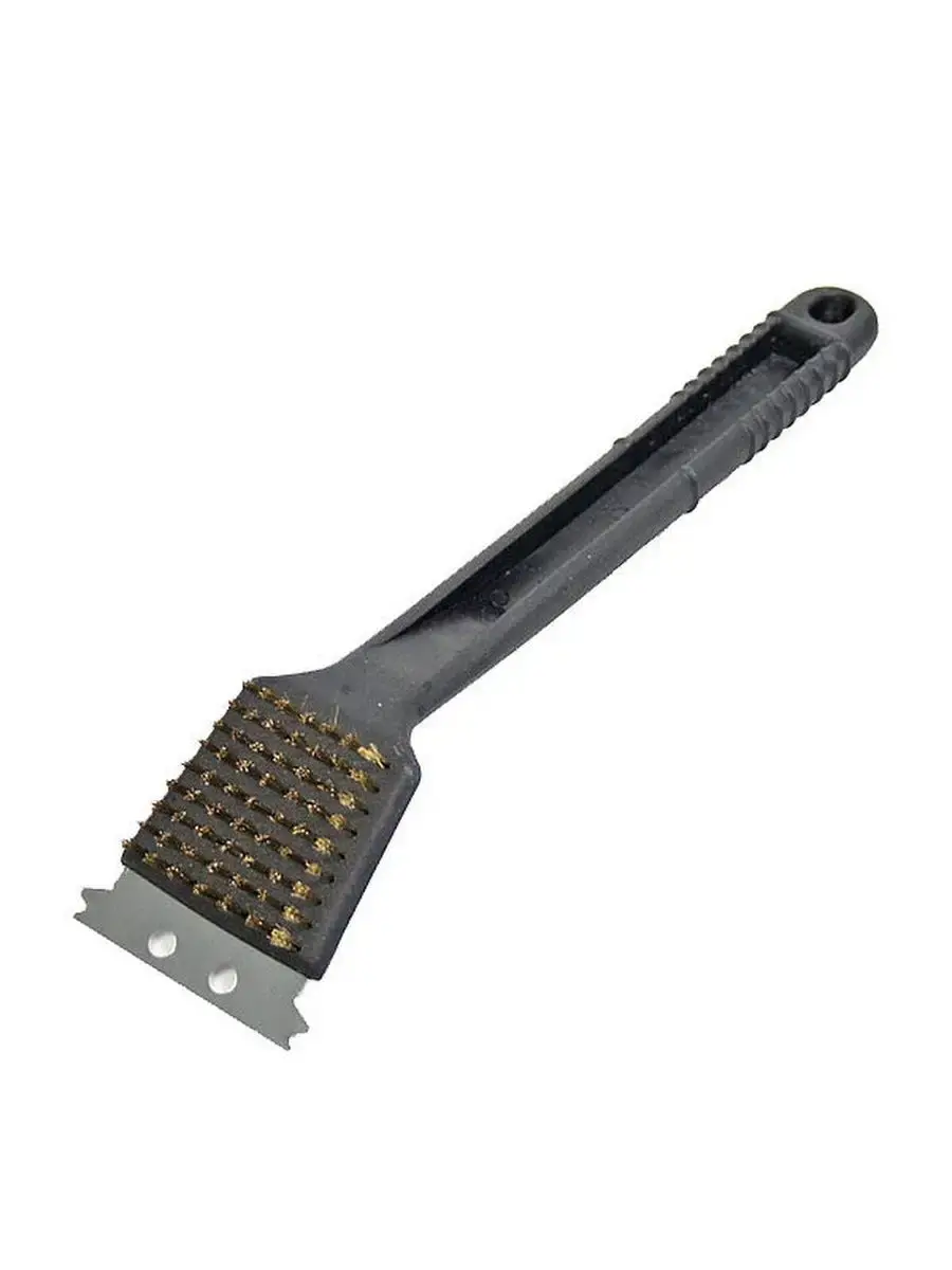 Щётка-скребок для чистки гриля,мангала,барбекю станет надёжным помощником во время мытья решёток гриль, шампуров, мангала и других металлических поверхностей. Жёсткая щетина эффективно удаляет остатки пищи и нагара, а скребок хорошо справляется с более трудными загрязнениями. Практичный подарок для тех, кто любит жарить шашлыки.Аксессуар имеет два чистящих приспособления металлическую щетку, стальной скребок для удаления пригоревшей пищи и трудно устраняемых загрязнений. Рукоятка с рельефной поверхностью удобно лежит в руке, что повышает комфортность эксплуатации, а отверстие в рукоятке позволяет организовать подвесное хранение щетки.Щетка для гриля решетки барбекю снабжена специальными пазами для чистки прутьев решеток гриля.Щетка-скребок пригодится каждой хозяйке на кухне, часто используется после приготовления блюд на древесном угле в походных условиях совместно с мангалом или барбекю. Щетка для мытья решетки гриль выполнена из прочной нержавеющей стали, поэтому устойчива к истиранию.Стальная щетка 2 в 1 используется в том числе для чистки казанов,противней,коптильней,сковородок,камина,электрогриля,котелков.