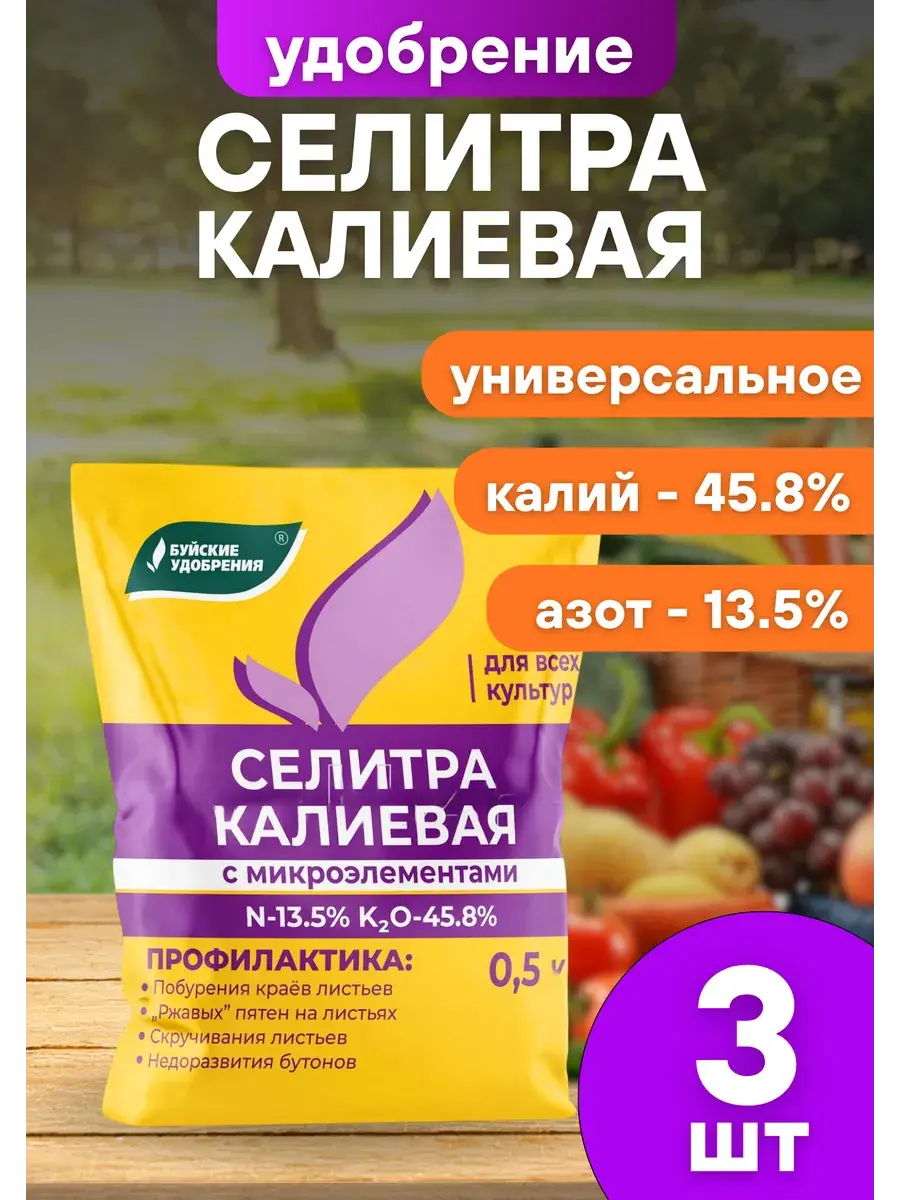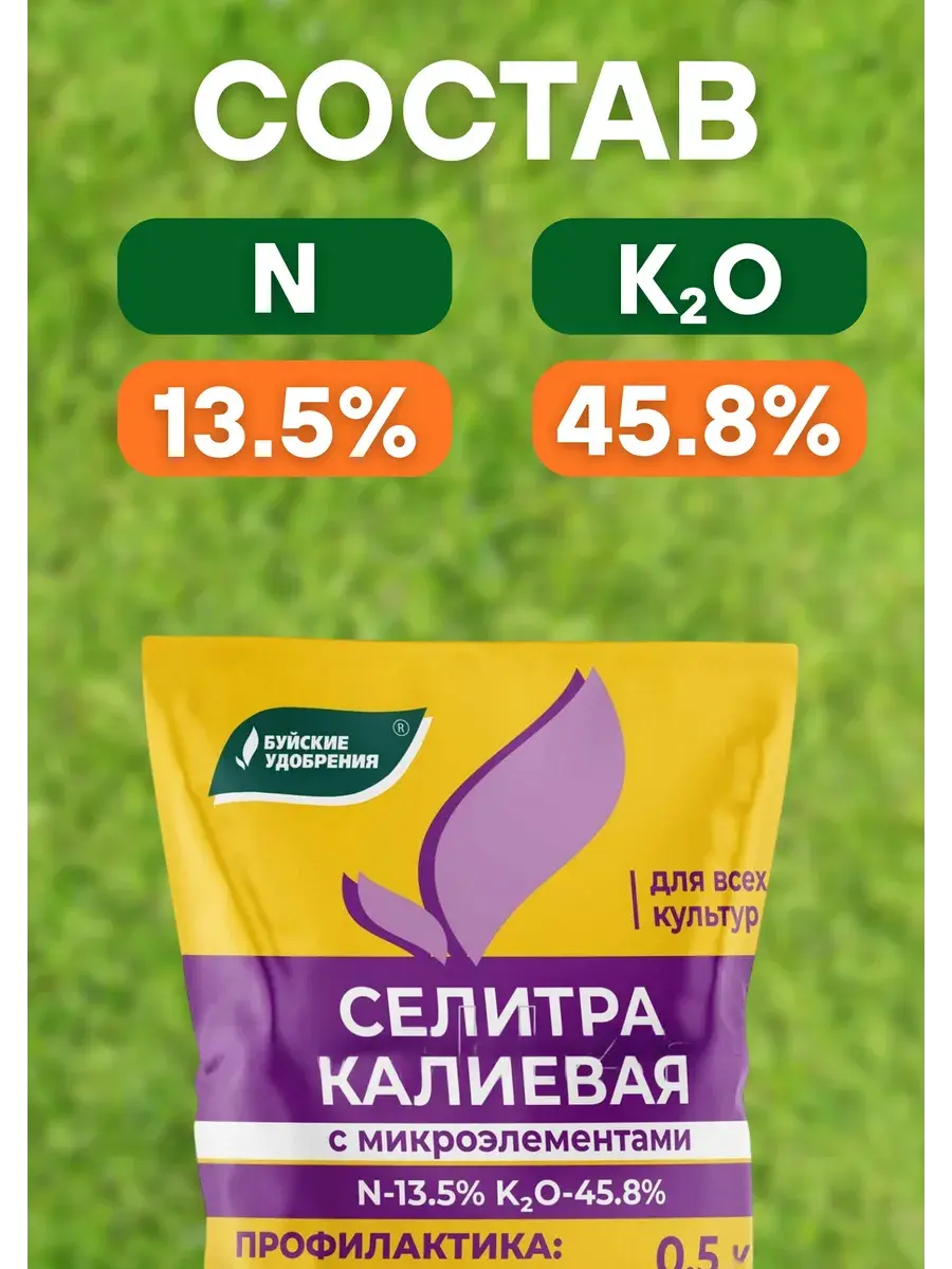 Селитра калиевая с микроэлементами — сбалансированное питательное средство, подходящее для регулярных подкормок большинства культур в саду, огороде и теплице. Благодаря высокой концентрации калия (45,8%) и азота (13,5%), а также включению важных микроэлементов (железо, бор, цинк, медь, марганец, молибден), это удобрение стимулирует активный рост, образование завязей и повышает качество урожая.