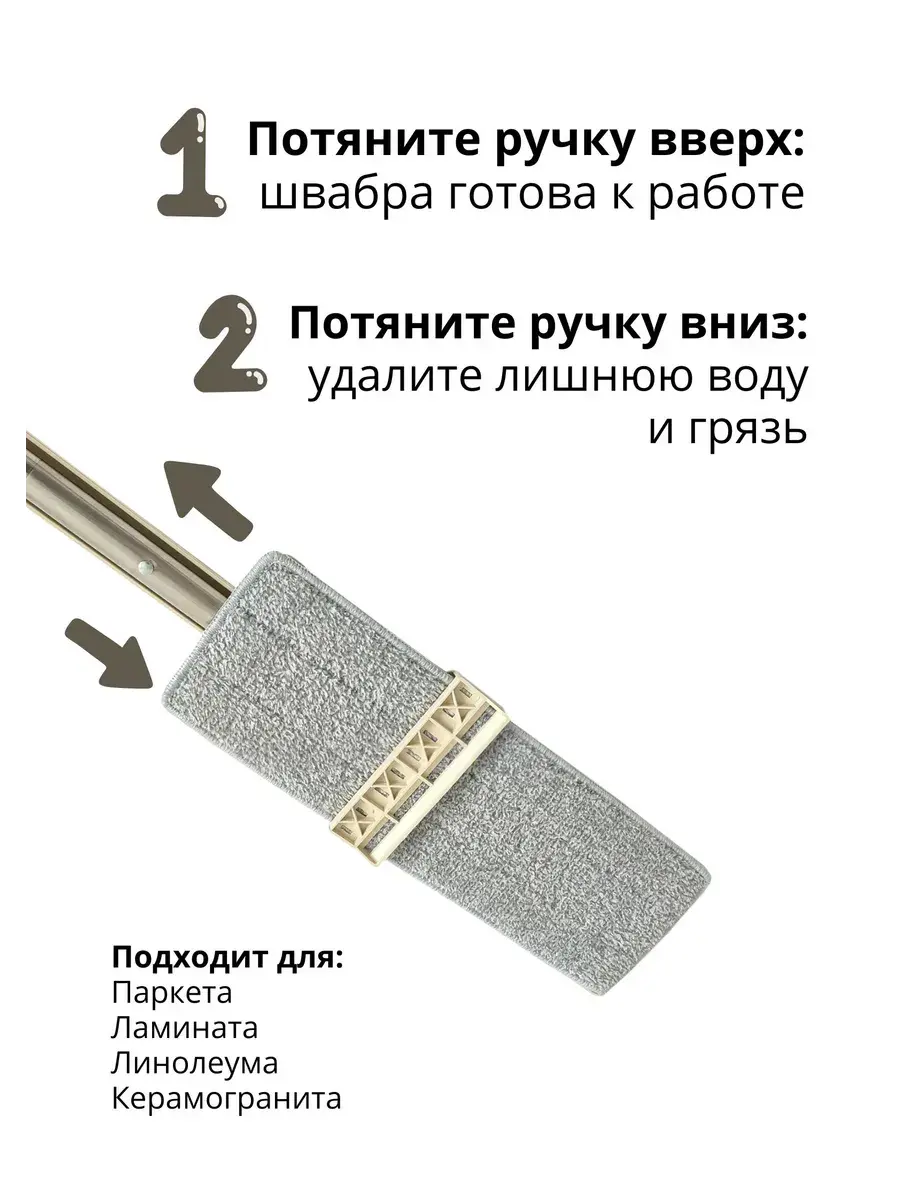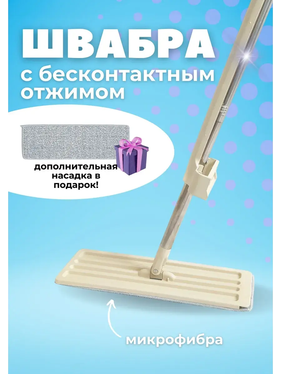 Хозяйственная швабра от нашего магазина сделает вашу уборку ещё быстрее и приятнее! Главная особенность умной швабры, делающая мытьё полов с ней таким простом - бесконтактная уборка: не нужно носить за собой ведро или касаться грязной насадки швабры. Моющая швабра с бесконтактным отжимом маневренная: так вы сможете очистить даже самые труднодоступные места. В том числе и вертикальные поверхности! У домашней швабры удобная пластиковая длинная рукоятка и тряпка из микрофибры. Отлично впитывает жидкости большая широкая насадка из микрофибры, которая подойдёт и для чистки пыли, и для линолеума. Также есть функция отжима. Приобретите универсальное приспособление для дома, кухни, гостиной, столовой. Удобная швабра отлично подойдёт и в качестве подарка себе, маме и любой хозяйке!