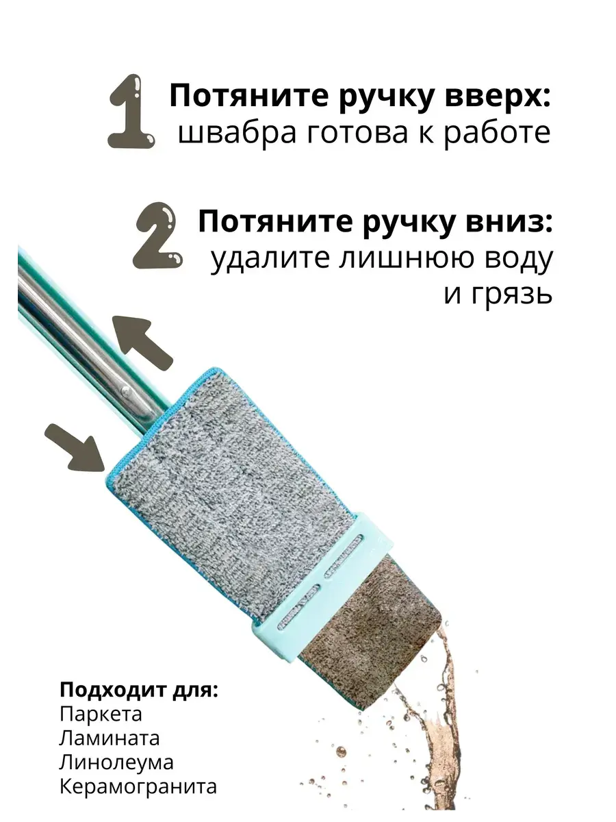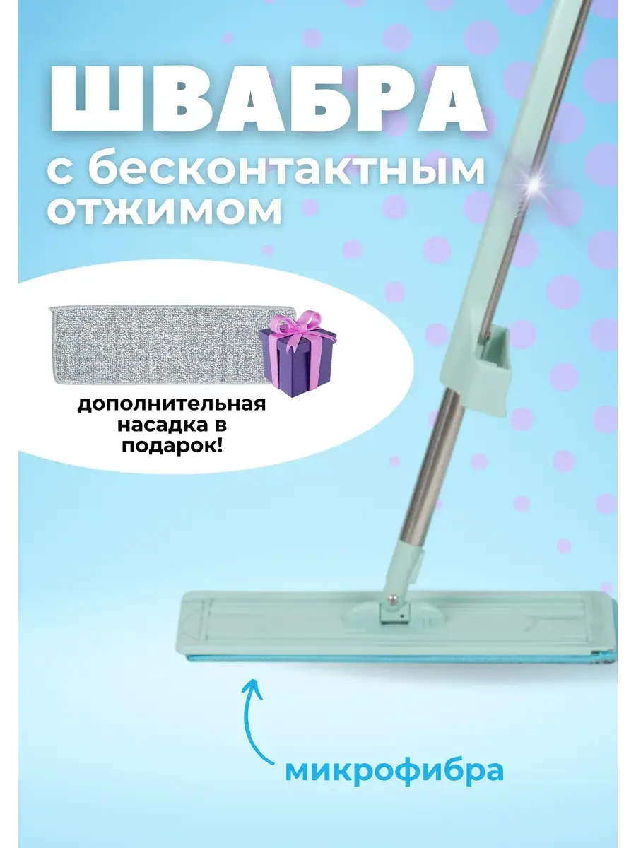 Хозяйственная швабра от нашего магазина сделает вашу уборку ещё быстрее и приятнее! Главная особенность умной швабры, делающая мытьё полов с ней таким простом - бесконтактная уборка: не нужно носить за собой ведро или касаться грязной насадки швабры. Моющая швабра с бесконтактным отжимом маневренная: так вы сможете очистить даже самые труднодоступные места. В том числе и вертикальные поверхности! У домашней швабры удобная пластиковая длинная рукоятка и тряпка из микрофибры. Отлично впитывает жидкости большая широкая насадка из микрофибры, которая подойдёт и для чистки пыли, и для линолеума. Также есть функция отжима. Приобретите универсальное приспособление для дома, кухни, гостиной, столовой. Удобная швабра отлично подойдёт и в качестве подарка себе, маме и любой хозяйке!