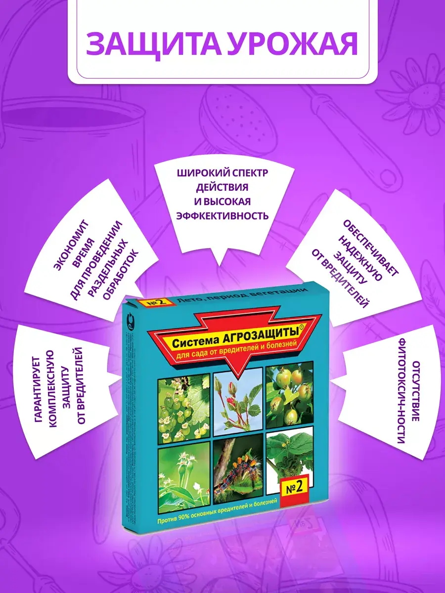 “Система агрозащиты для сада №2” – это комплекс препаратов для надежной защиты садовых растений от насекомых-вредителей и различных болезней в период вегетации. Он состоит из двух средств, которые применяются в виде бинарной смеси для обеспечения комплексной защиты.