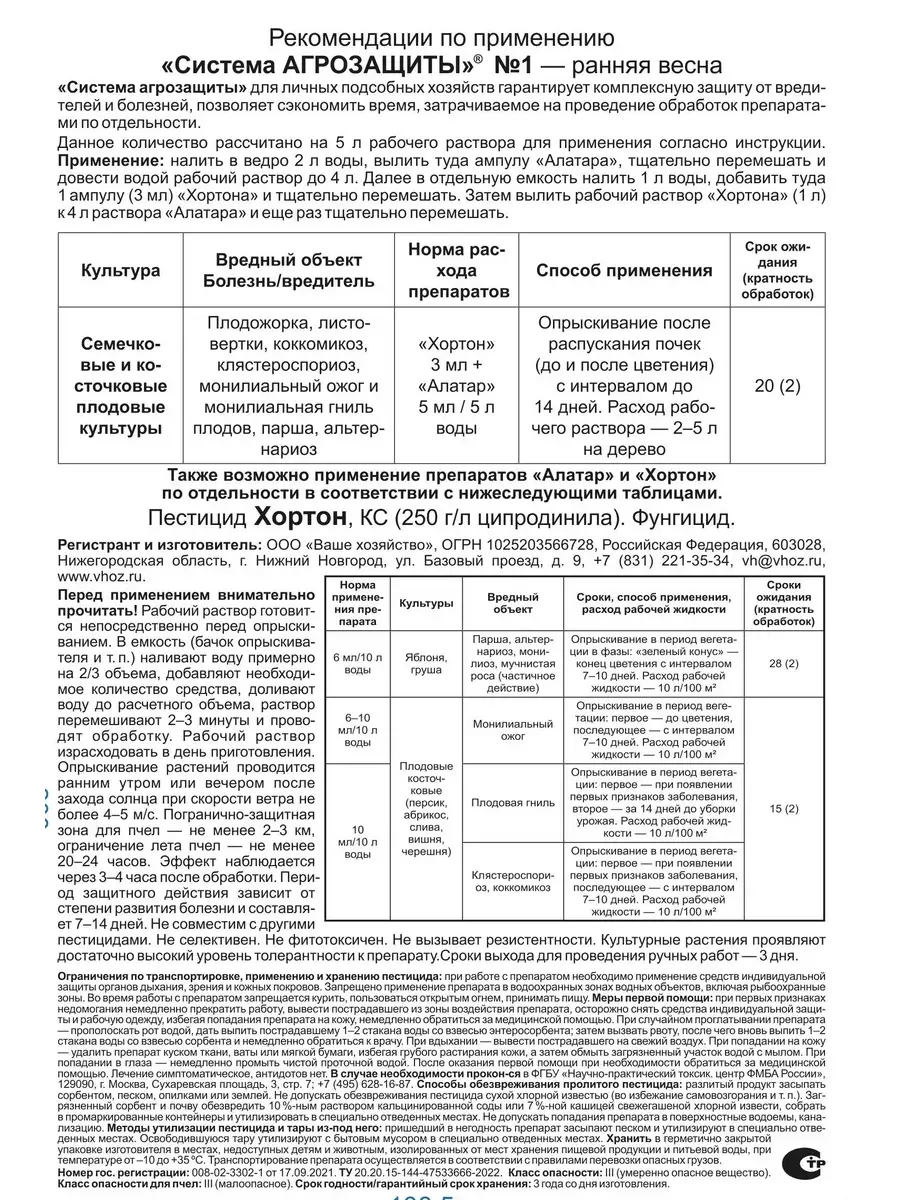 Система Агрозащиты №1 для сада – это набор из трех препаратов для самостоятельной защиты вашего сада от вредителей и различных болезней. Этот комплект идеально подойдет для ранней весны. Система Агрозащиты обеспечивает надежную и эффективную защиту растений благодаря бинарной смеси препаратов. Эта технология гарантирует комплексную защиту от вредителей и болезней, что значительно упрощает процесс ухода за садом. Препараты, входящие в состав набора, проверены на совместимость и отсутствие фитотоксичного воздействия на растения. Это позволяет сэкономить время на проведении отдельных обработок, а также исключает возможность ошибок при смешивании препаратов. Средства оптимально подобраны с учетом сезонных особенностей и фаз развития растений, что обеспечивает их высокую эффективность и безопасность для окружающей среды. Широкий спектр действия Системы Агрозащиты позволяет использовать ее для обработки различных видов растений, включая плодовые деревья, ягодные кустарники, овощи и цветы. Благодаря этому, ваш сад будет надежно защищен от вредителей и заболеваний в течение всего сезона. Состав «Хорус», ВДГ — 750 г/кг ципродинила; «Алатар», КЭ — концентрат эмульсии 225 г/л малатион + 50 г/л циперметрин.