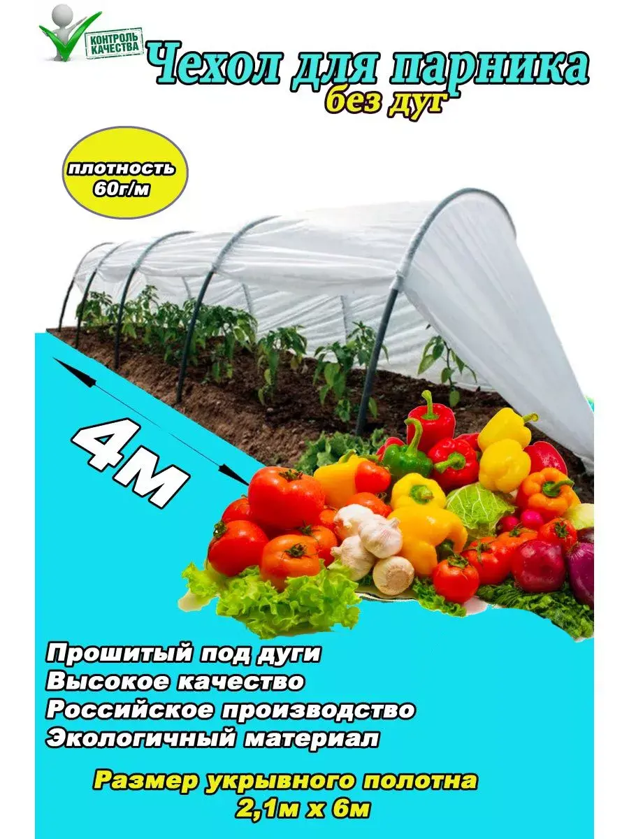 ВНИМАНИЕ!!!ДУГИ В КОМПЛЕКТЕ НЕ ИДУТ. Чехол для парника под 4 дуги, спанбонд 60 г/м², размер 2.1×6 м.Прочный чехол для парника из материала спанбонд плотностью 60 г/м² — надёжная защита ваших растений в любое время сезона. Подходит для установки на 4 дуги, идеально укрывает грядку шириной 2,1 м и длиной 6 м.Особенности:Материал: нетканый спанбонд — воздухопроницаемый, влагостойкий, устойчивый к ультрафиолету.Плотность: 60 г/м² — обеспечивает высокую защиту от перепадов температур, насекомых и осадков.Назначение: парник садовый, укрытие для овощей, зелени, рассады, клубники, цветов и других культур. Преимущества:Долговечный и многоразовый материал.Удерживает тепло и влагу, создавая благоприятный микроклимат.Легко фиксируется на дугах и удобно в использовании.Подходит для большиства видов арочных парников. Надежная защита, легкость установки и долговечность - все это делает этот чехол идеальным выбором для любого садовода или огородника.Использование теплицы для рассады для дома позволит Вам раньше начать посев, защищая растения от заморозков, сквозняков и солнечных ожогов. Спанбонд укрывной прекрасно пропускает влагу и воздух, создавая необходимый микроклимат в парнике и позволяя получить урожай на 10-12 дней раньше Укрывной материал препятствует образованию конденсата. Незаменим в большей части нашей страны при разных температурах от -5 С до +40 С Полив рассады осуществляется методом дождевания по укрывному материалу. Агроткань не разрушается под воздействием УФ-излучения и других неблагоприятных природных факторов. Так же укрывной материал для растений Спанбонд можно стирать в машине при 40С.
