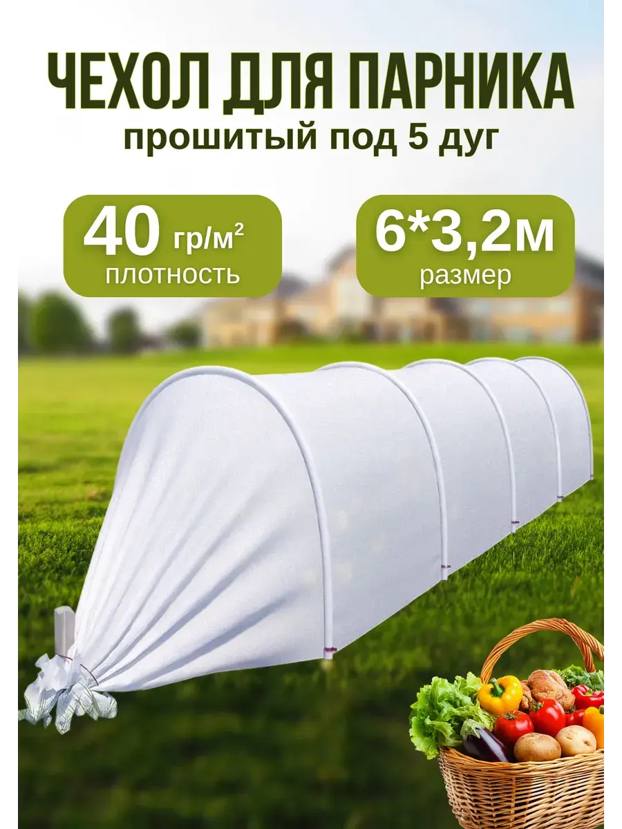 ВНИМАНИЕ!!!ДУГИ В КОМПЛЕКТЕ НЕ ИДУТ. Чехол для парника под 5 дуги, спанбонд 40 г/м², размер 3.2×6 м. Прочный чехол для парника из материала спанбонд плотностью 40 г/м² — надёжная защита ваших растений в любое время сезона. Подходит для установки на 5 дуг, идеально укрывает грядку шириной 3,2 м и длиной 6 м. Особенности:Материал: нетканый спанбонд — воздухопроницаемый, влагостойкий, устойчивый к ультрафиолету.Плотность: 40 г/м² — обеспечивает высокую защиту от перепадов температур, насекомых и осадков.Назначение: парник садовый, укрытие для овощей, зелени, рассады, клубники, цветов и других культур. Преимущества:Долговечный и многоразовый материал.Удерживает тепло и влагу, создавая благоприятный микроклимат.Легко фиксируется на дугах и удобно в использовании.Подходит для большиства видов арочных парников. Надежная защита, легкость установки и долговечность - все это делает этот чехол идеальным выбором для любого садовода или огородника.Использование теплицы для рассады для дома позволит Вам раньше начать посев, защищая растения от заморозков, сквозняков и солнечных ожогов. Спанбонд укрывной прекрасно пропускает влагу и воздух, создавая необходимый микроклимат в парнике и позволяя получить урожай на 10-12 дней раньше Укрывной материал препятствует образованию конденсата. Незаменим в большей части нашей страны при разных температурах от -5 С до +40 С Полив рассады осуществляется методом дождевания по укрывному материалу. Агроткань не разрушается под воздействием УФ-излучения и других неблагоприятных природных факторов. Так же укрывной материал для растений Спанбонд можно стирать в машине при 40С.