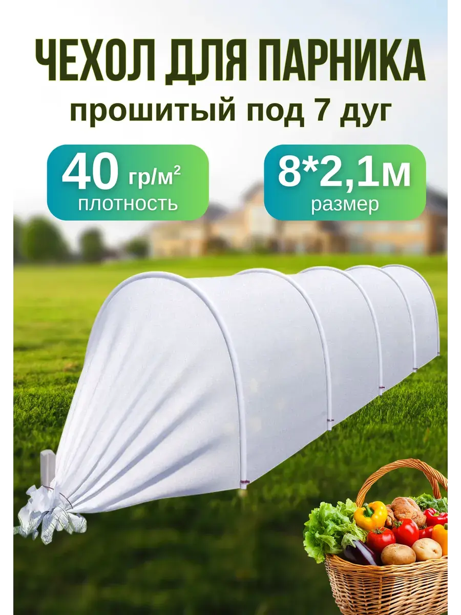 ВНИМАНИЕ!!!ДУГИ В КОМПЛЕКТЕ НЕ ИДУТ. Чехол для парника под 7 дуг, спанбонд 40 г/м², размер 2.1×8 м. Прочный чехол для парника из материала спанбонд плотностью 40 г/м² — надёжная защита ваших растений в любое время сезона. Подходит для установки на 7 дуг, идеально укрывает грядку шириной 2,1 м и длиной 8 м. Особенности:Материал: нетканый спанбонд — воздухопроницаемый, влагостойкий, устойчивый к ультрафиолету.Плотность: 40 г/м² — обеспечивает высокую защиту от перепадов температур, насекомых и осадков.Назначение: парник садовый, укрытие для овощей, зелени, рассады, клубники, цветов и других культур. Преимущества:Долговечный и многоразовый материал.Удерживает тепло и влагу, создавая благоприятный микроклимат.Легко фиксируется на дугах и удобно в использовании.Подходит для большиства видов арочных парников. Надежная защита, легкость установки и долговечность - все это делает этот чехол идеальным выбором для любого садовода или огородника.Использование теплицы для рассады для дома позволит Вам раньше начать посев, защищая растения от заморозков, сквозняков и солнечных ожогов. Спанбонд укрывной прекрасно пропускает влагу и воздух, создавая необходимый микроклимат в парнике и позволяя получить урожай на 10-12 дней раньше Укрывной материал препятствует образованию конденсата. Незаменим в большей части нашей страны при разных температурах от -5 С до +40 С Полив рассады осуществляется методом дождевания по укрывному материалу. Агроткань не разрушается под воздействием УФ-излучения и других неблагоприятных природных факторов. Так же укрывной материал для растений Спанбонд можно стирать в машине при 40С.