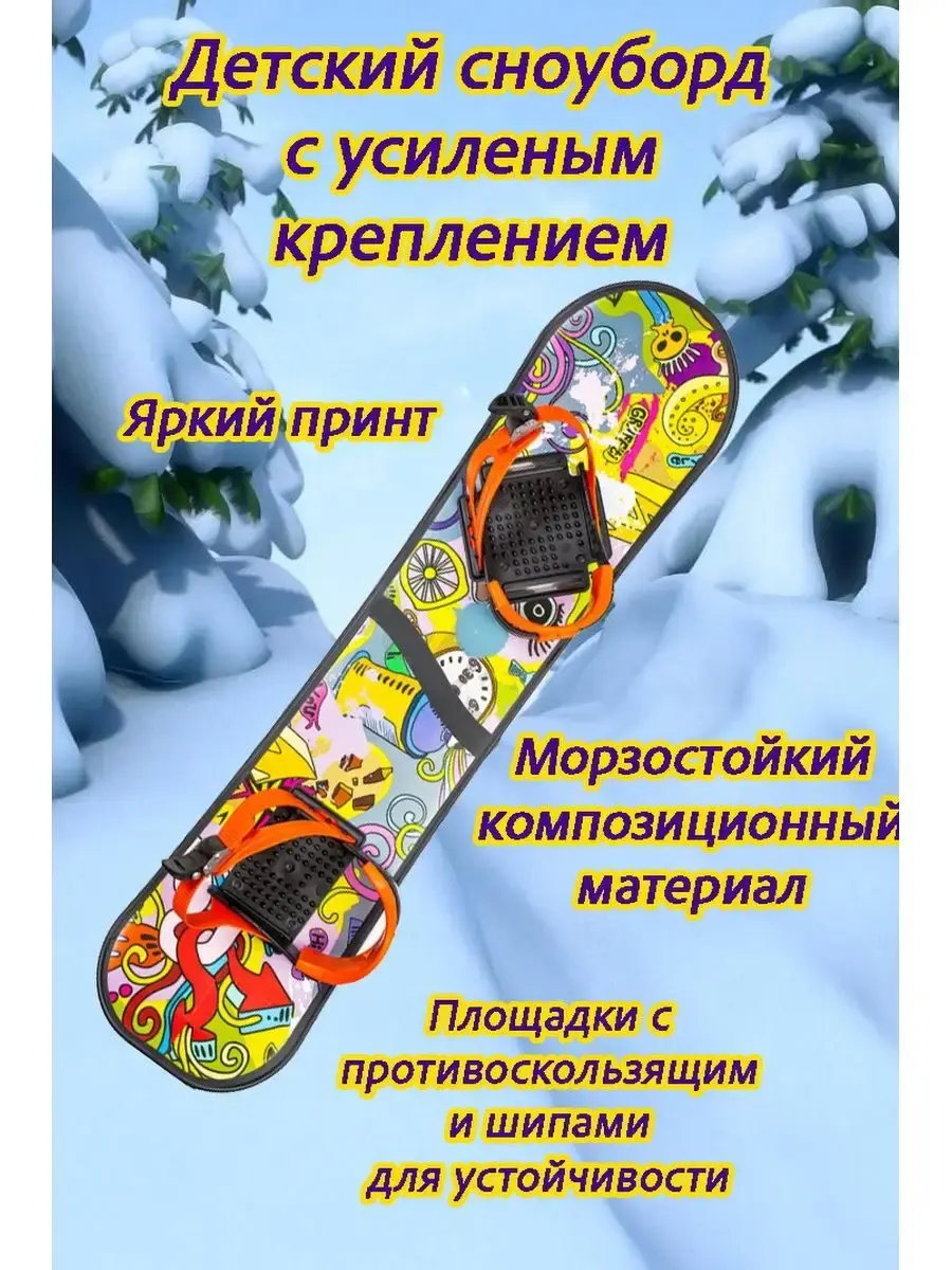 Доска сноуборда детского с креплением сделана из морозостойкого композиционного материала и выдерживает динамические нагрузки. Нога к доске надёжно крепится при помощи крепления, аналогично как на взрослом сноуборде. Гибкие передние ремни регулируются по длине пряжкой/защёлкой. Для надёжной фиксации пятки имеется дополнительная накладка на задний ремень. Крепление переставляются как под правую, так и под левую ведущую ногу. На доске под креплением имеются площадки с противоскользящими шипами для устойчивости. Для катания не нужна специальная обувь. Сноуборд детский с креплением идеально подойдёт для катания с горки по прямой, а также управлять доской и выполнять простейшие элементы сноубординга. Общие характеристики. Материал: пластик. Комплектация: сноуборд с 2-мя креплениями. Размер: 950х225 мм. Возраст: 5+. Максимальный вес: до 50 кг. КРЕПЛЕНИЯ ЗАСТЕГИВАЮТСЯ СНИЗУ В ПАЗЫ.